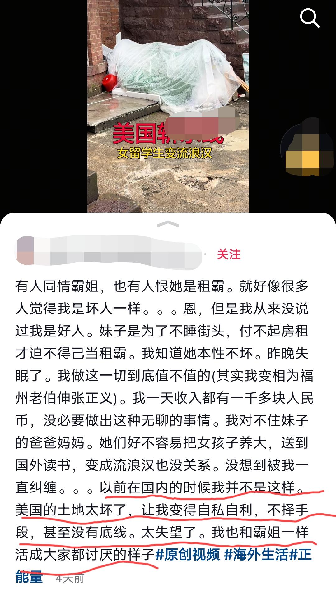 拿到美国绿卡的女留学生,因长期拖欠房租在海湾华人圈爆红!目前流浪街头成了独特的风景,被人纷纷拍照打卡…… 视频发布者好像是要把“霸姐”从房子里面赶出来的那个人(帮房东腾退),他表示自己以前在国内的时候也不是这样的,现在自己都变得自私自利,不择手段,甚至没有底线,他和“霸姐”一样活成了大家讨厌的样子! 网友吐槽:大家都是中国人,为什么就不能包容一点呢?