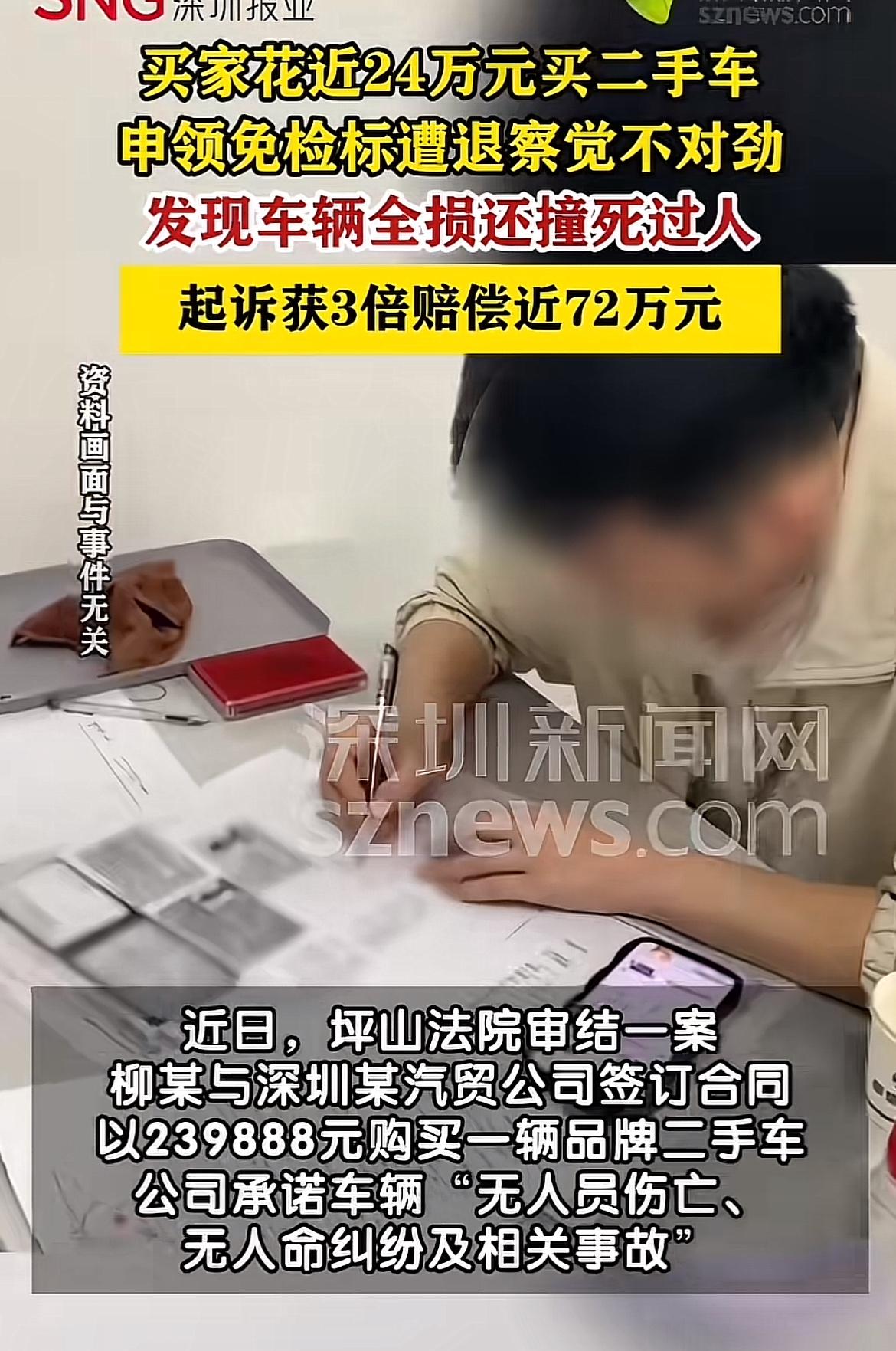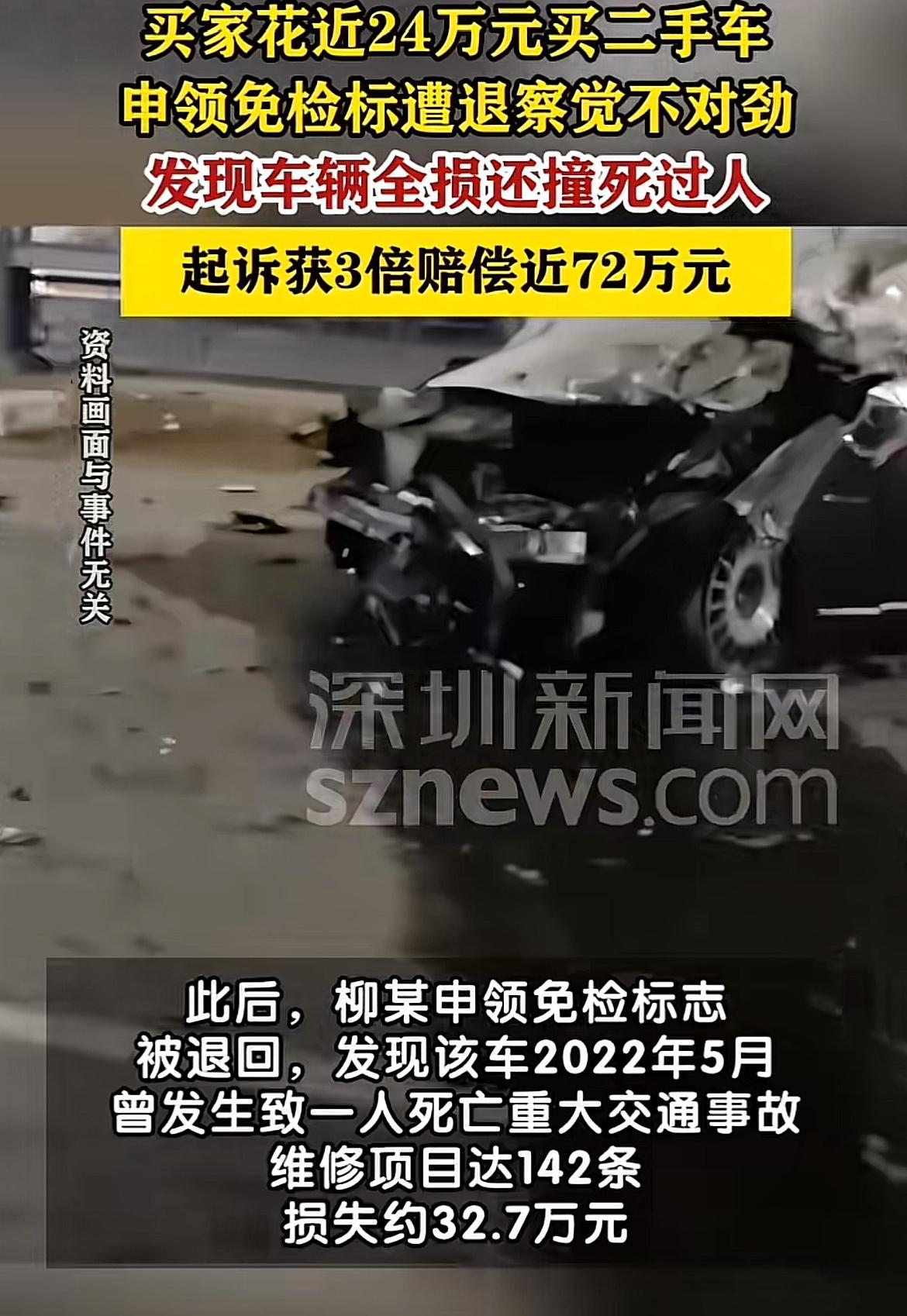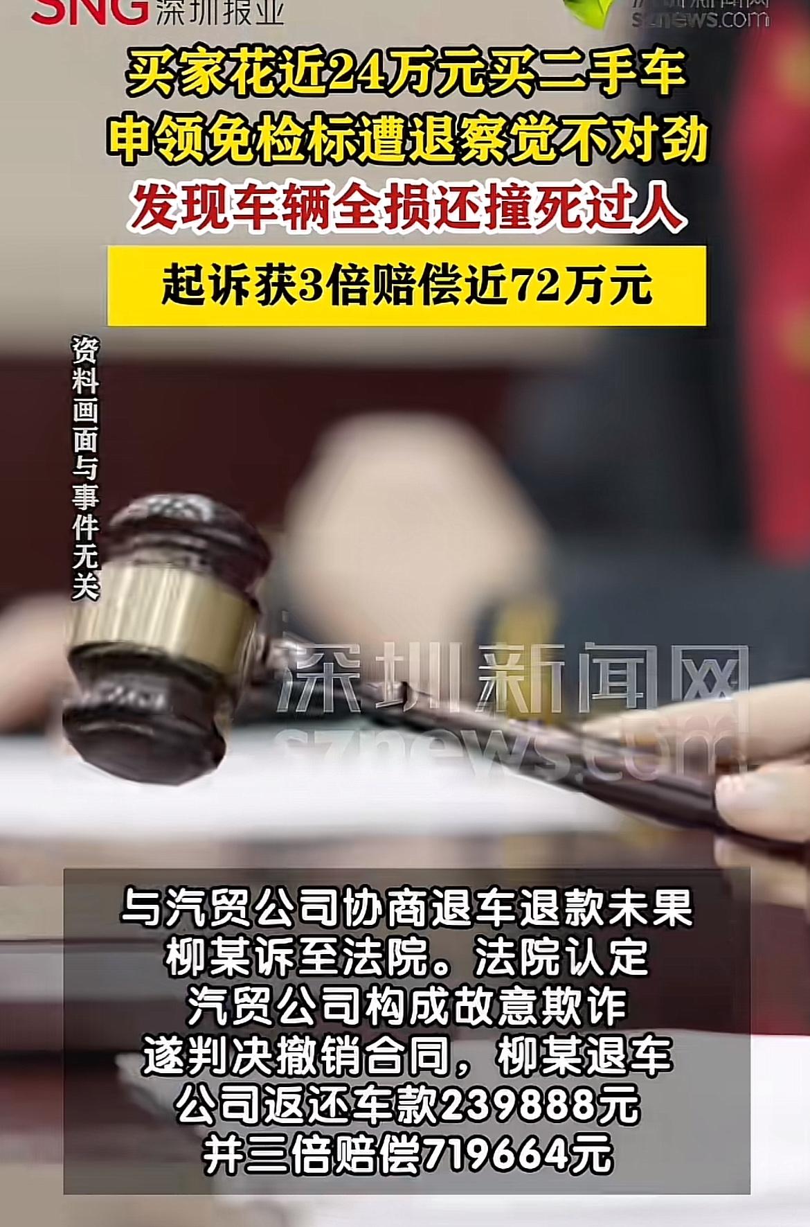 24万买二手车,本以为捡了大便宜,结果却成了噩梦!2023年11月,柳某花239888元从深圳某汽贸公司买了辆二手车,对方还保证无人员受伤、无人命纠纷。可到了2024年10月,申请免检标被退回,一查才发现这车是全损车,还有撞死人的重大事故,发动机、变速箱等核心部件都有异常。 柳某这膈应得不行,找汽贸公司协商退车。好在最后起诉获赔近72万。买二手车可得擦亮眼睛啊,不然像柳某这样,真是花钱买罪受!