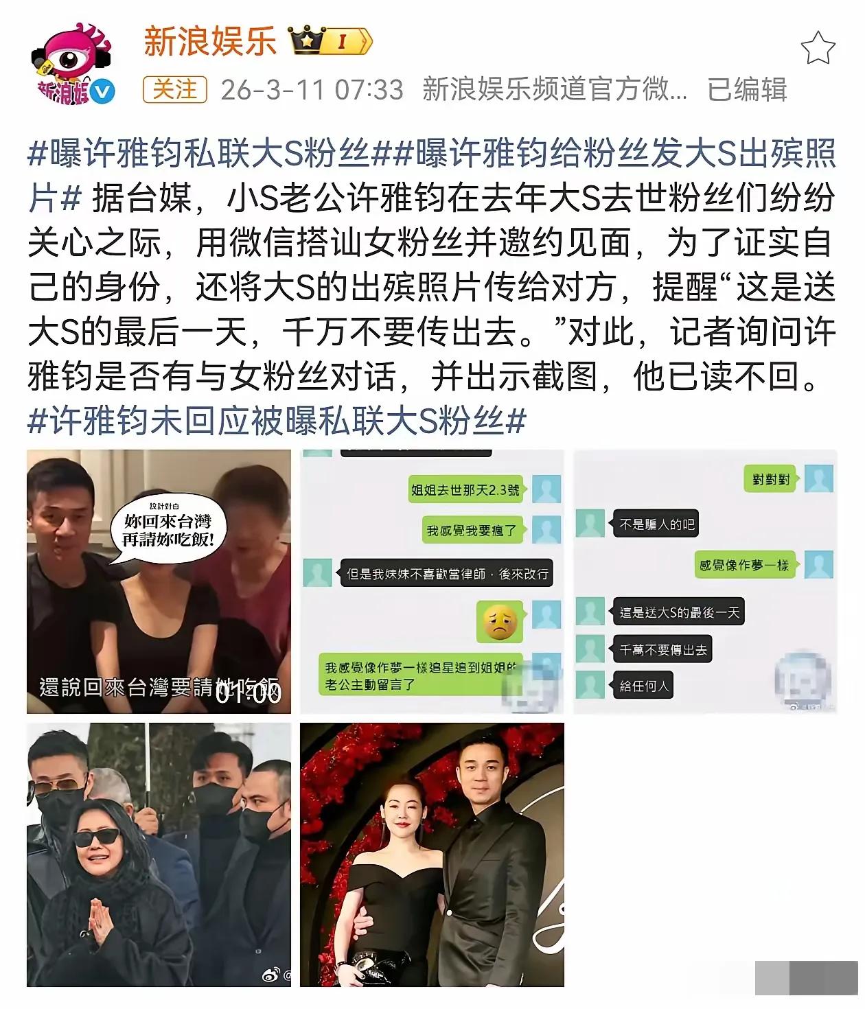 许雅钧撩大S女粉丝,他可是哥伦比亚大学毕业的,会这么没脑子吗?台媒的报道,准不准确? 许雅钧向大S粉丝发布,大S出殡照片,让她保密,这也太离谱了吧! 台媒爆料,许雅钧向大S女粉丝说大S真的超惨的,女粉丝难过表示,姐姐是被汪渣母子网暴死的,感冒只是压死她最后一根稻草。 小S刚复出,还在台北街头搞粉丝接待会,许雅钧又爆出新花样,他与女粉丝聊天截图到底是不是真的? 如果是真的,徐妈,包括小S都要崩溃。 大S没去世前,女粉丝天天发声,酸辣粉水军说她是徐家派来的,骂她绿茶。 许雅钧则安慰粉丝,并问对方是台湾人吗? 粉丝回说,是的,台北人,姐夫,我在北京学习大陆法律。 喊许雅钧姐夫,也没搞清楚,难道是顺着小S叫的。 女粉是法律系的,许雅钧又和她聊开了,他称妈妈与妹妹都是律师。 许雅钧还透露了,妹妹不喜欢当律师,后来改行了。 小S的婆婆,许雅钧的妈妈确实是一名律师,小S在综艺节目中,有一次打电话向婆婆求助过。 但是许雅钧貌似没有妹妹,只有一个姐姐,一直留着短发,从面相上来看,也是像姐姐的,比许雅钧看起来要大几岁。 大S去世之后,她还发长文悼念,并晒出两人的合影。 大家觉得许雅钧与女粉的聊天截图,是真是假? 如果是真的,相信小S可能会跟许雅钧离婚,毕竟姐姐是她最在意的人。 来自台媒官方报道