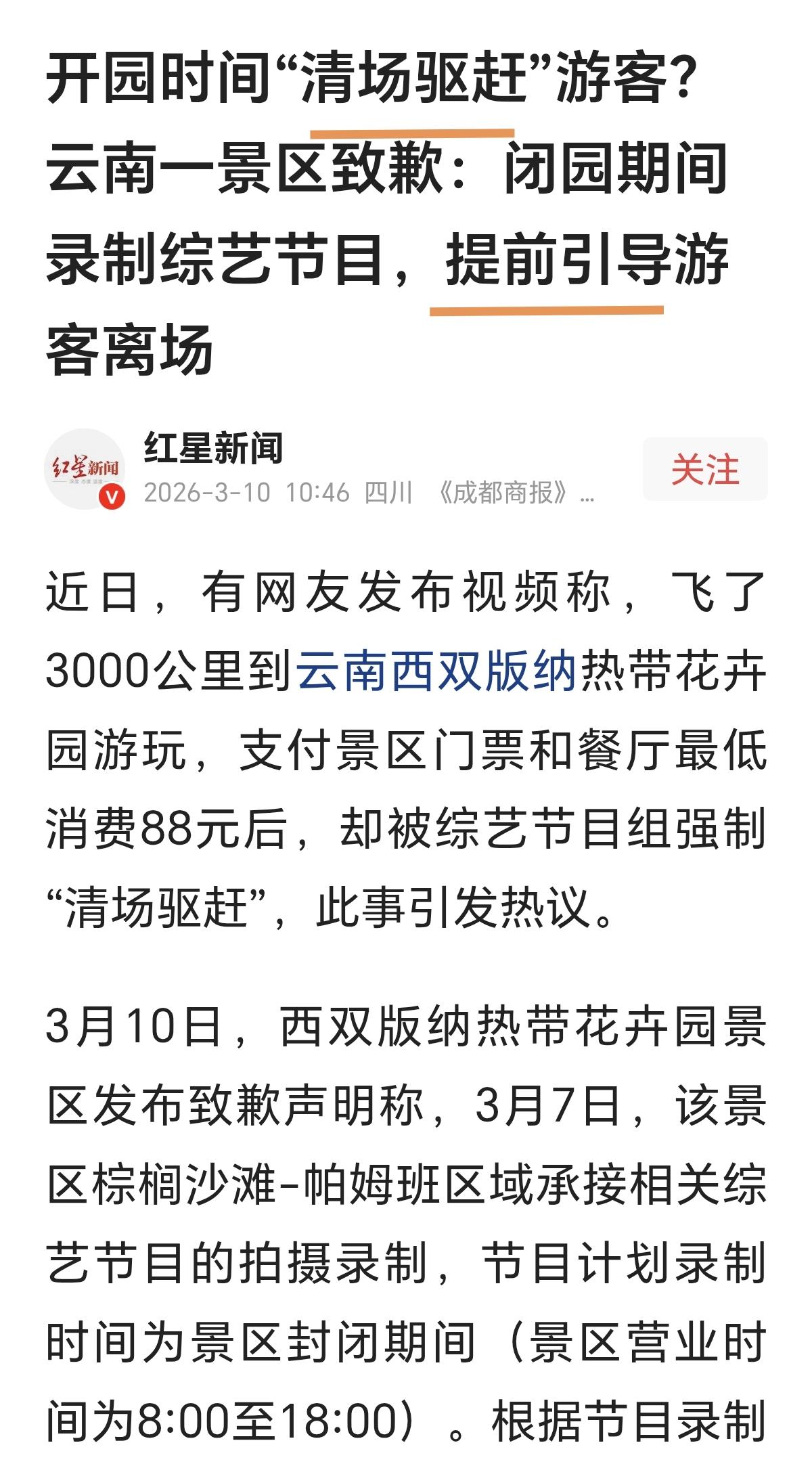 是“清场驱赶”还是“提前引导”只是一个表达方式的不同,重要的是已经影响游客心情了。这家花卉园并不完全是以游客为中心,在道歉的同时还不忘给自己找个台阶下。 游客到版纳这家花卉园是带着美好的心情去欣赏热带花卉的,但所谓的“提前引导”已经破坏了这种氛围,影响了当时游客的心情。 当然,如果当时工作人员的态度和表达方式不妥,这件事对游客的影响就更加深、更加大。 如果这家花卉园是以游客为中心,就应该采用稳妥的方式接待节目组,而不是不顾游客的感受,只顾着服务节目组。 如果这家花卉园想赚节目组的钱,就应该合理安排节目组占用花卉园的时间,并且提前告知游客,或者在门票上给予打折,给游客知情权和选择权。 所谓的“提前引导”不存在工作方式和态度等方面的妥与不妥,因为这件事本身就不应该发生。 从现场的视频看,工作人员是错上加错,游客对于节目组的事并不知情,而且工作人员还是蛮横无理地让游客早点离开。 如果你在一家餐厅正吃着的时候就有服务员提醒你,催你快点吃,快到下班时间了,你是什么心情? 总之,这家花卉园既要又要,而事后又换了一个说辞去描述工作人员当时的不当行为,这样的道歉显得寡淡无味。