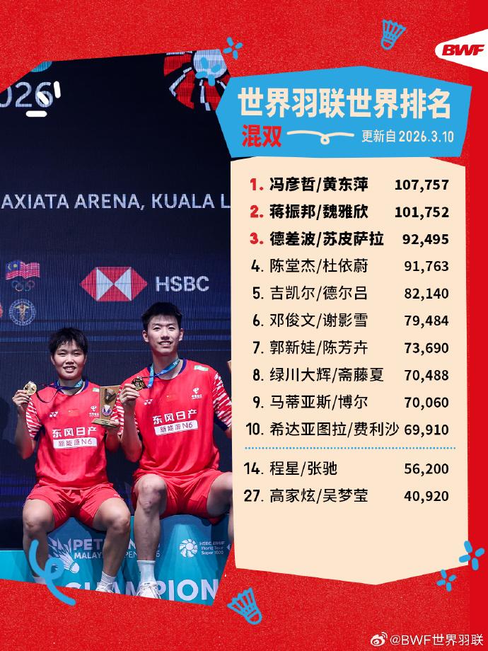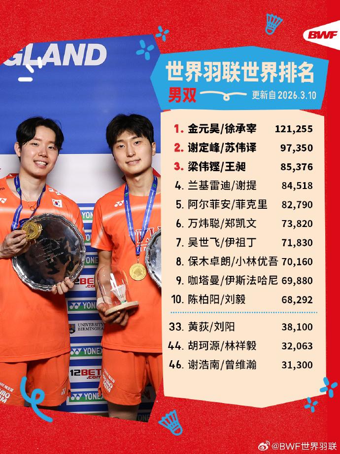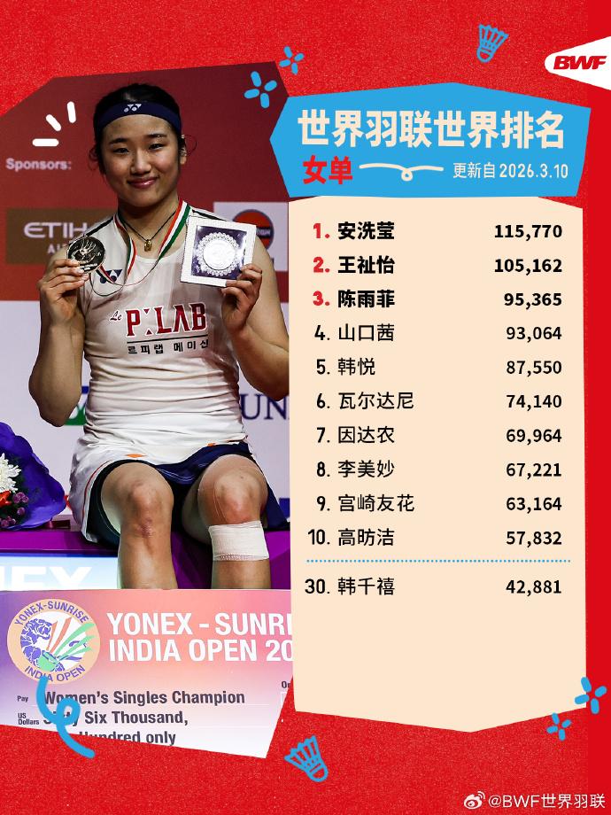 世界羽联更新最新世界排名: 泰国名将昆拉武特凭借近期出色的表现,超越石宇奇重返男单世界第一宝座。 女单安洗莹、男双金元昊/徐承宰、女双刘圣书/谭宁、混双冯彦哲/黄东萍继续稳居各单项榜首。