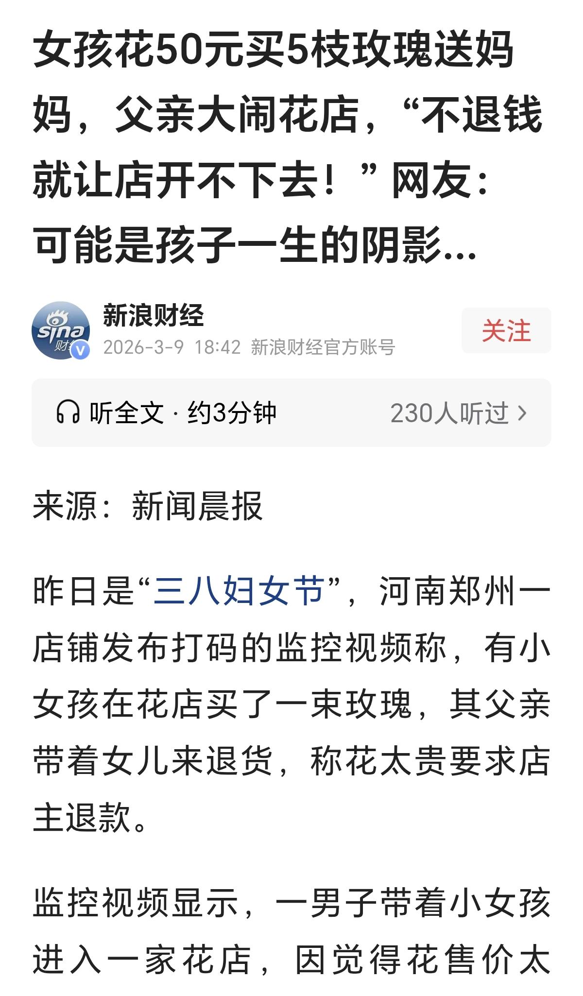 50块钱一束花是孩子送给妈妈过节的礼物,他到花店这么一闹,真是大煞风景,还有心情过节吗? 孩子去花店用50元买了5支玫瑰是当成“妇女节”的礼物送给妈妈的,多少钱也是孩子的一份心意。 我觉得孩子妈妈收到这束花的时候,内心一定是愉悦的,而看到妈妈这么开心,孩子当时也应该是很快乐的。 这位当爸爸的却把这份美好用金钱来衡量,到花店大闹,要求退款,说50块钱就买了5朵花太贵了,还拍视频说这件事要多大就能有多大。 花店也是明码标价的,另外节假日的时候,玫瑰的价格略有上浮也是情理之中的事,有什么不妥? 并不是谁拍视频谁就有理。 他这一闹,花店自然是不高兴的,但也不会买他的账,而更重要的是,买花的孩子和过节的妈妈又是怎样的感受?