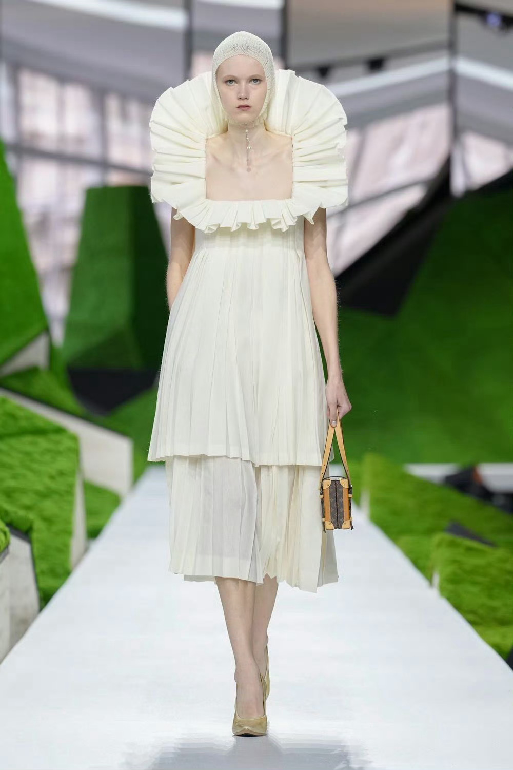 这次LV直接把卢浮宫改成了「流动的田园剧场」,满场的绿色苔藓装置,把自然和古典建筑揉在一起,走秀像在山野里穿行,氛围感直接拉满。