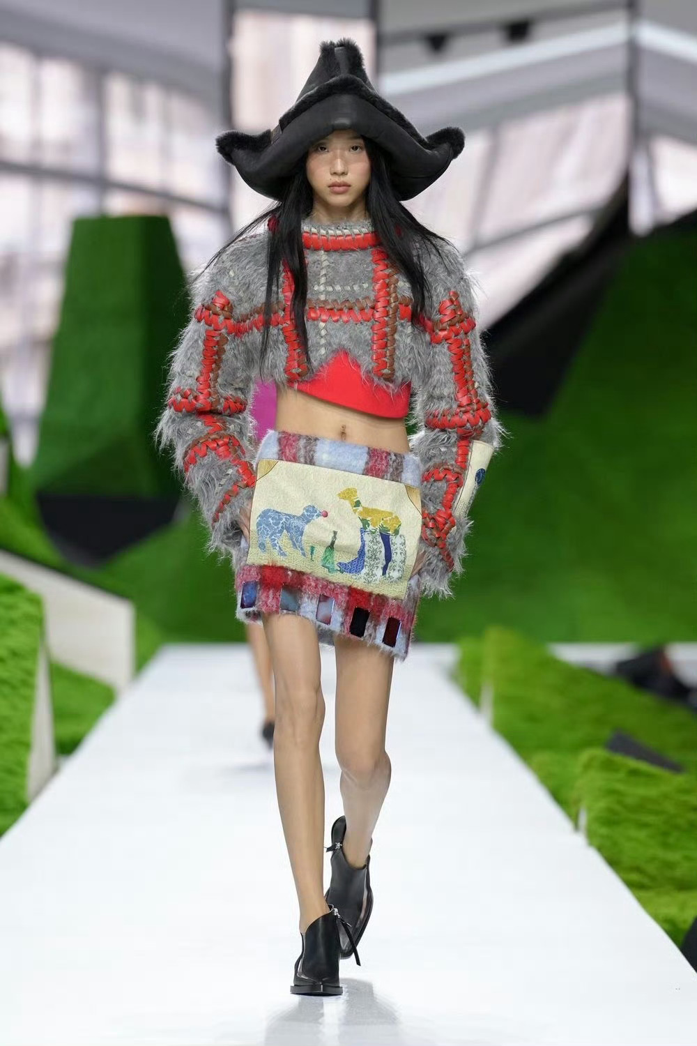 设计上主打「自然建筑感」:夸张的皮毛斗篷、几何肩线外套,看着很先锋,但其实藏着实穿小心机——宽松廓形能藏肉,植物性皮草和毛呢混纺,冬天保暖又不笨重;褶皱长裙、短款针织衫,日常搭个牛仔裤就能出街,不是那种只能看不能穿的秀场款。