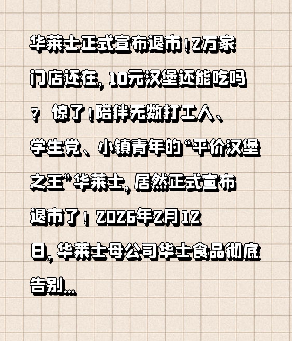 华莱士正式宣布退市!2万家门店还在,10元汉堡还能吃吗? 惊了!陪伴无数打工人、学生党、小镇青年的“平价汉堡之王”华莱士,居然正式宣布退市了! 2026年2月12日,华莱士母公司华士食品彻底告别新三板,结束近十年资本生涯。消息一出,全网炸锅:是不是要倒闭了?以后还能吃到10元3个的汉堡吗?2万家门店会不会一夜关门?今天一次性说透,真相比你想的更扎心! 先别慌,华莱士不是破产,是主动退市!官方说为了提高决策效率、降低成本,听着像套话,背后藏着三大难言之隐。 第一,资本成了累赘。挂牌近十年,只融到1000万,连开20家店都不够,每年还要花大价钱做审计、披露信息,相当于花钱买枷锁,干脆不玩了。 第二,低价红利耗尽,竞争杀疯了。曾经靠“便宜”横扫全国,门店比肯德基麦当劳加起来还多。可现在塔斯汀崛起、大牌疯狂降价,华莱士利润薄到离谱,毛利率才6%,赚的都是辛苦钱。 第三,负债高、品控乱。21亿负债、73%负债率,食品安全问题反复被吐槽,扩张太快管不过来,想转型又不敢涨价,进退两难。 说白了,不是不想干,是资本这条路走不通,不如轻装上阵,专心管门店、搞供应链。 其实我们怀念的,从来不是华莱士有多好吃,而是它陪我们走过的那些穷日子。 学生时代省吃俭用,10块钱就能吃饱;加班到深夜,楼下的华莱士永远亮着灯;回老家县城,它是最常见的连锁快餐。便宜、方便、接地气,是无数普通人的快餐慰藉。 退市不代表消失,2万家门店正常营业,10元汉堡还在。它只是褪去资本光环,回归一家普通快餐店的本质。 这也像极了我们的人生:年轻时拼命扩张、追求光鲜,到最后才发现,踏实过日子、守住初心,比什么都重要。 你吃过华莱士吗?最常点的是什么?评论区聊聊!