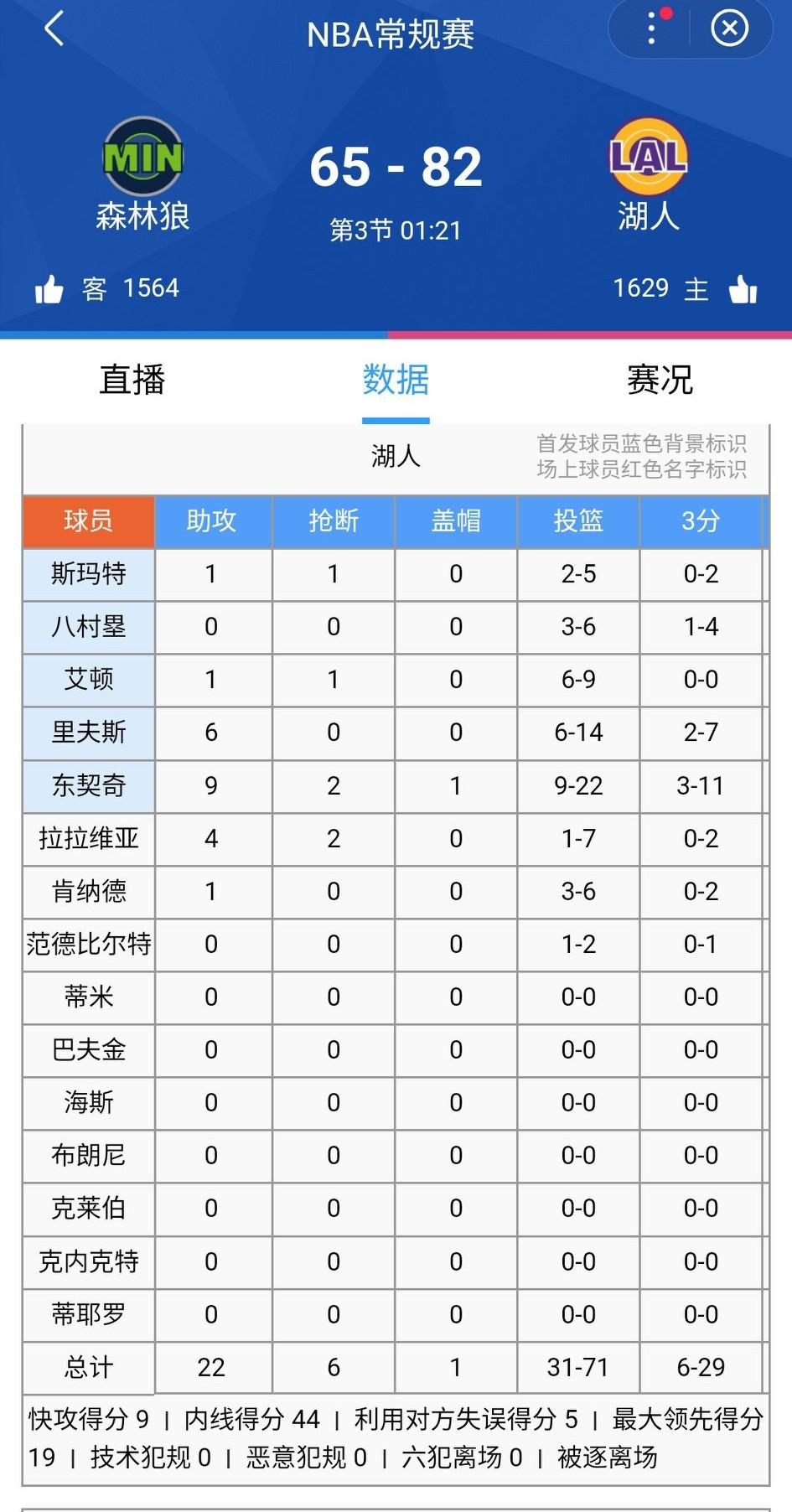 今天湖人森林狼成了打铁大战!首节打了半节,森林狼12中2、湖人9中1。 第三节还有1分20秒,森林狼57投22中,湖人71投31中。双方三分命中率都不怎么样,森林狼30投5中,湖人29中6投。
