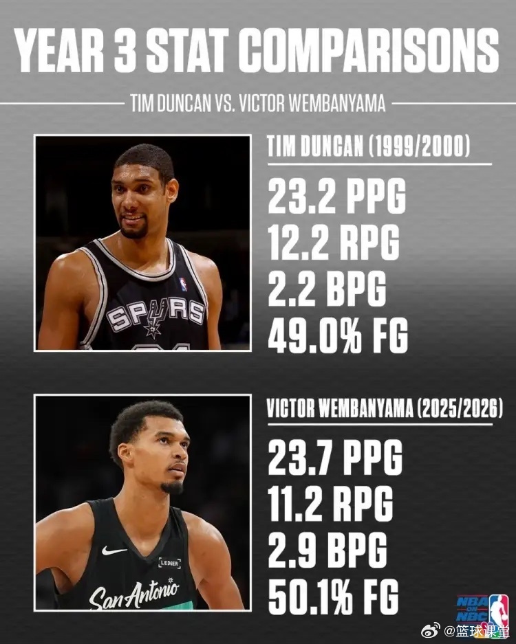 文班亚马、邓肯生涯第3年数据对比: