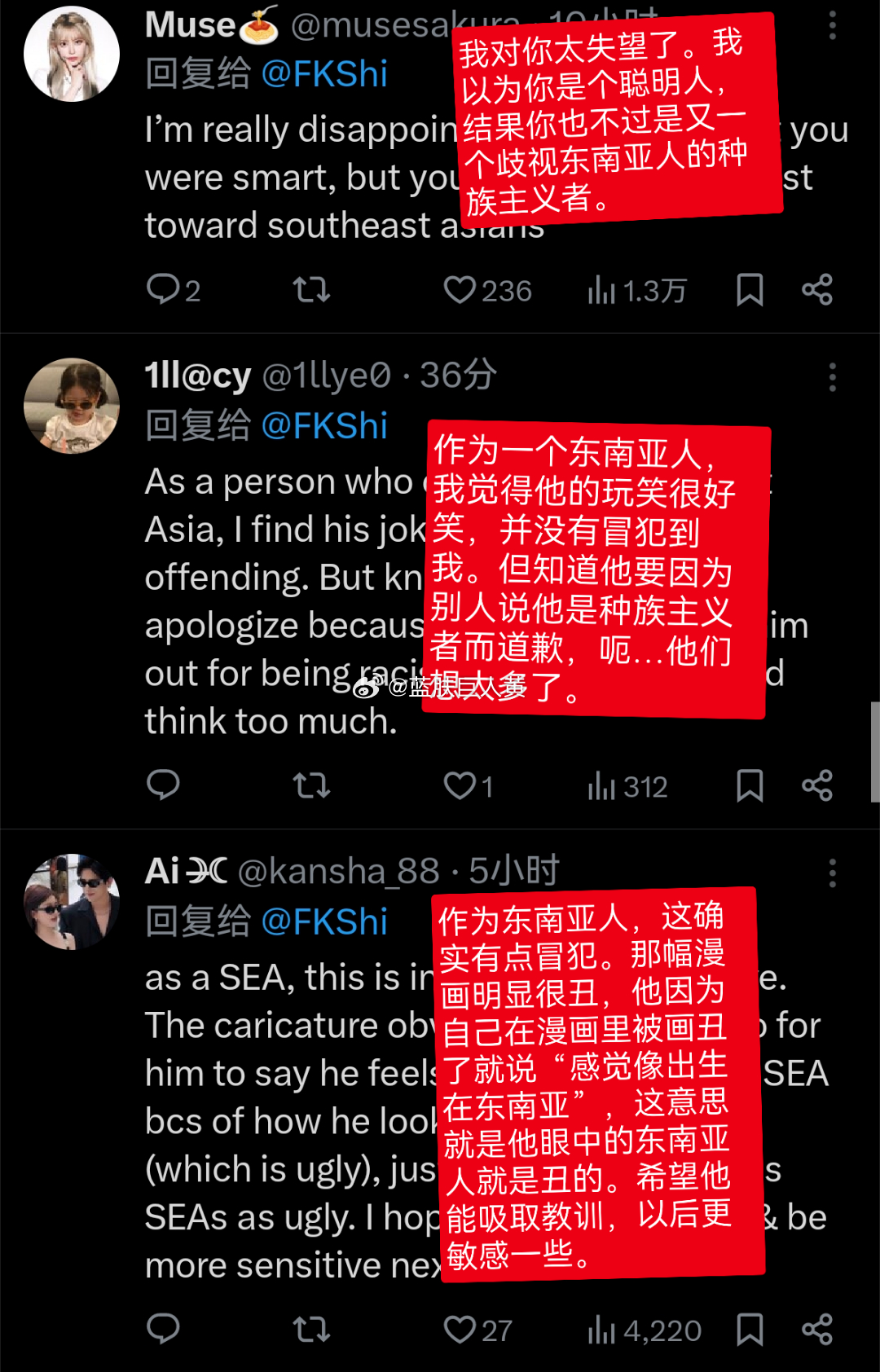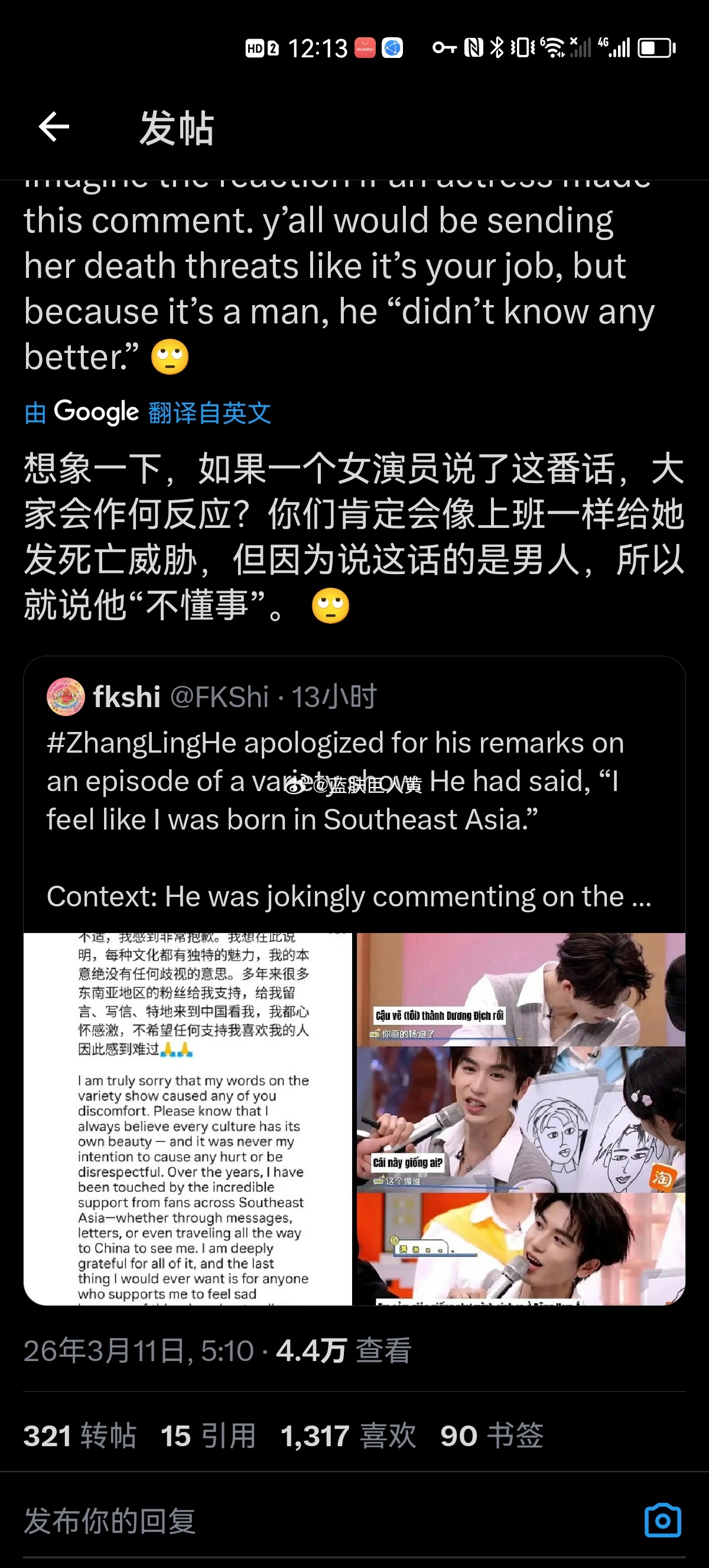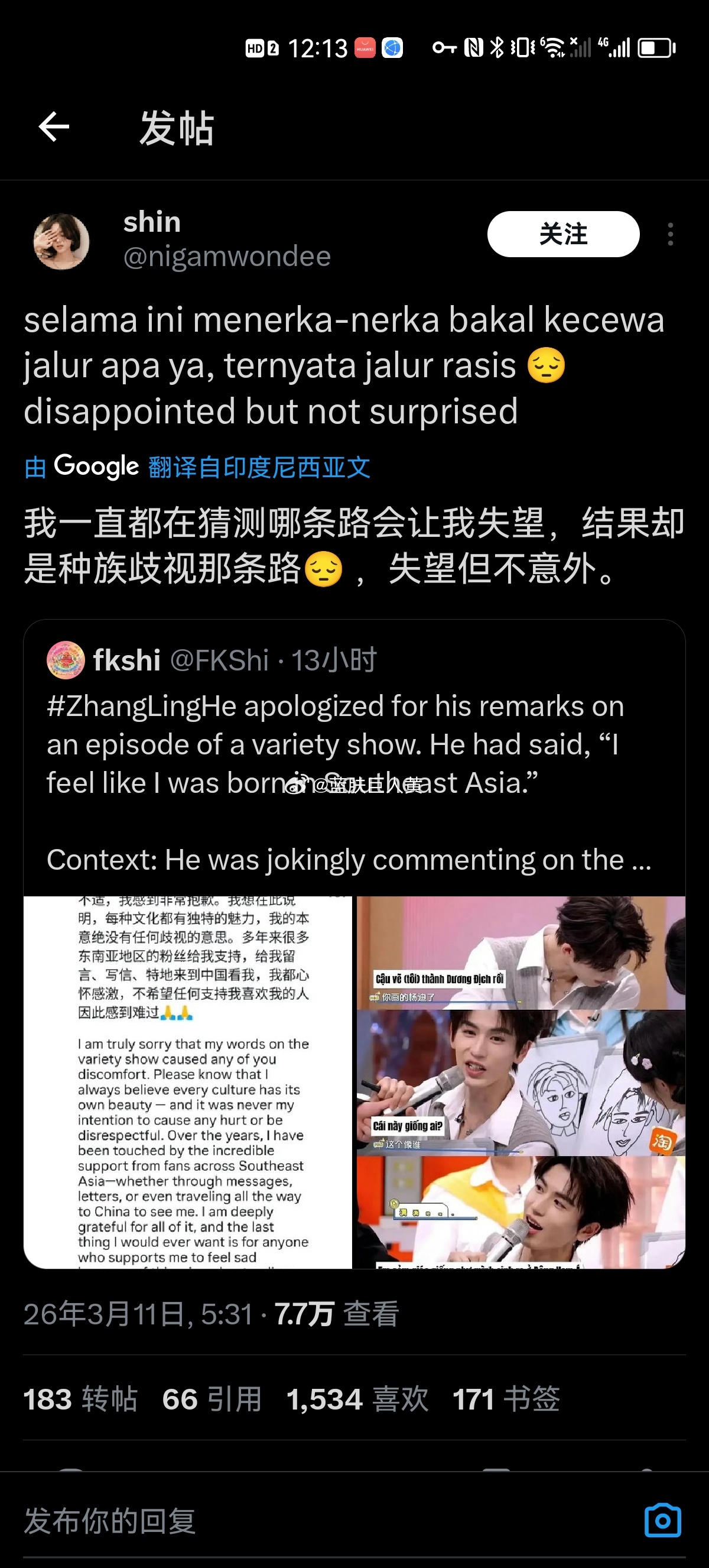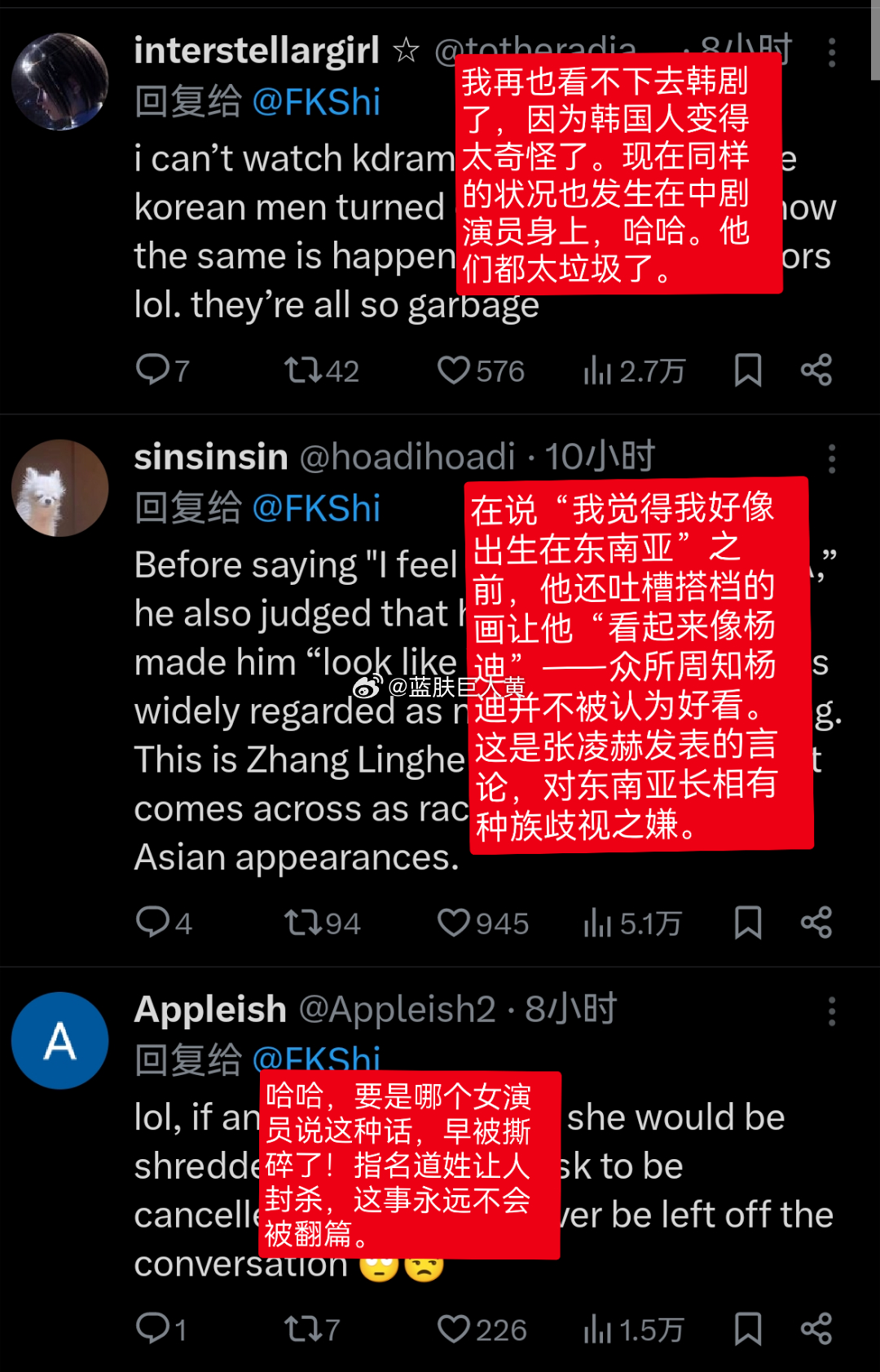 张凌赫在综艺节目上说田曦薇给他画的画像“让他感觉自己出生在东南亚”,这件事儿原本只有越南人炒作,张凌赫道歉后,现在推特热度上来了(昨天这帖子才20万,今天就140万流量了)
