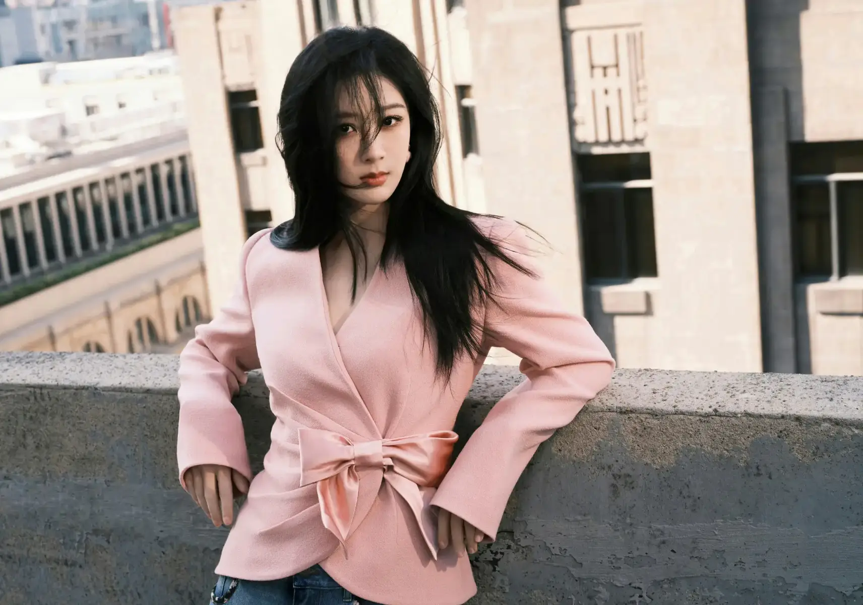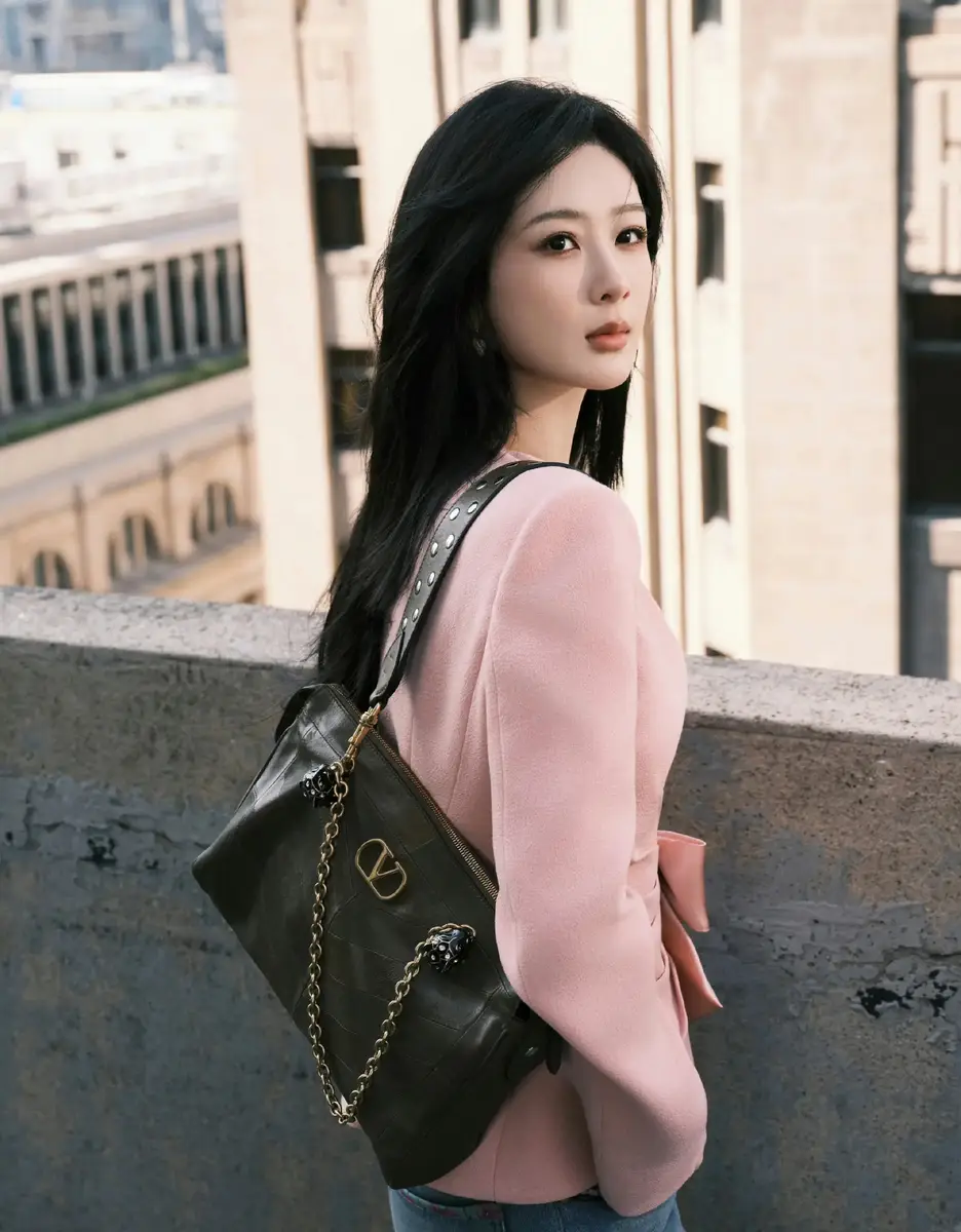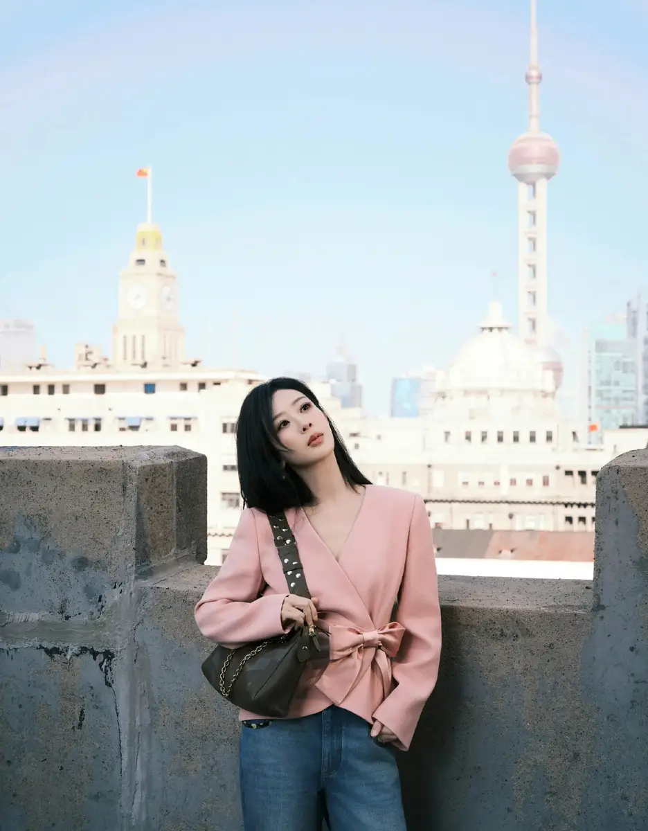 杨紫穿粉色西装配牛仔裤清新亮眼 背复古链条包包尽显都市优雅