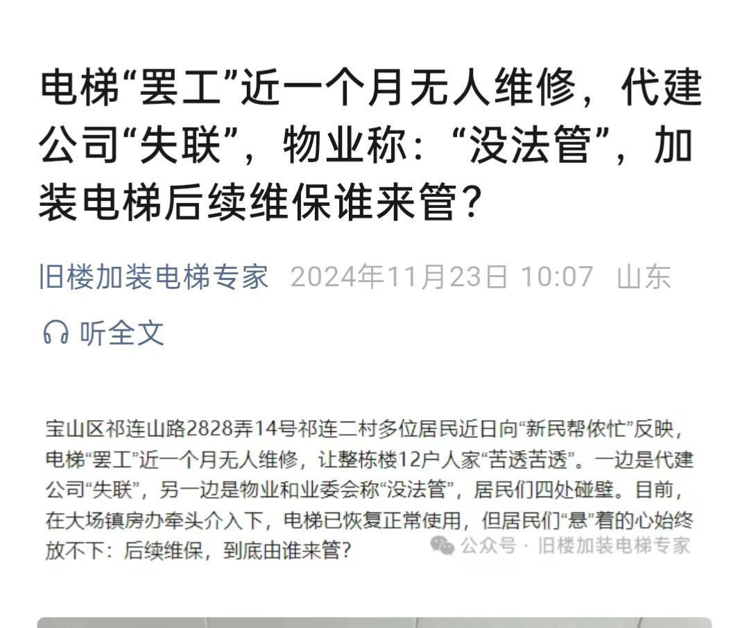 既然是老楼加装电梯是民生工程,业主希望和旧改小区一样由政府主导指定由资质的施工公司参与加装电梯工程,公开透明,这工程不应该由刚注册的中间代理梯商来操作为了赚钱挑起内斗,挑拔邻里关系并雇佣梯托们在网上对政府的政策断章取义大造声势花言巧语忽悠大爷大妈们,这样为人民服务了,是为人民币服务了,为此,从中出现了骗取按装费卷钱跑路的梯商坑害老百姓!