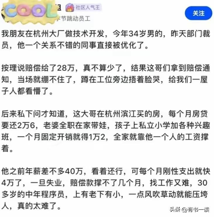 杭州大厂员工集体“爆雷”!一把精准踩中所有坑,高薪没了,房贷、养娃压得喘不过气! 尤其是阿里体系内的年轻人,集体陷入房贷崩盘、收入断裂的绝境。有人前一天还是年薪百万的精英,第二天就沦为连房贷都还不起的“负翁”。 追根溯源,核心就四个字:过度透支。这群年轻人大多在行业最红火时进大厂,拿着让人羡慕的薪资,身边人都在买房、换车、晒生活,不知不觉就被推着走上“极致透支”的路。 他们不是输在能力,而是精准踩中了人生的三大深坑,最终把一手好牌打得稀烂。 第一坑:被“人生标配”绑架,盲目加杠杆 早些年,杭州互联网红利期,大厂员工手握高薪,周围全是买房、换车、晒学区的氛围。年轻人被裹挟着,觉得不买大平层、不拿下顶级学区就是“输了人生”。 明明实力只够刚需,却硬着头皮上豪宅。数据显示,杭州部分核心区房价在高点较峰值回落超30%,一大批高位接盘的大厂人,房子市值直接缩水百万,首付亏光不说,想卖都卖不掉,彻底资不抵债。 第二坑:单收入支撑高负债,抗风险几乎为零 跟风结婚、生娃,为了所谓的“给孩子最好的”,一方辞职全职带娃。一个人赚钱养全家,房贷月供两三万,加上奶粉、早教、医疗,每一笔都是刚性支出。 最致命的是,他们把所有赌注压在一份工作上,没有备用存款,没有副业,只要遭遇行业波动,家庭财务瞬间断裂。 阿里某P7级员工,3年前以4.5万/㎡入手杭州某改善盘,月供2.8万。本以为高薪能稳一辈子,却遇上公司优化被裁。新工作薪资腰斩,房贷、养娃、生活开支一分没少。撑了不到半年,存款彻底见底,房子眼看要被法拍,孩子的学费还没凑齐,一夜之间从云端跌回泥潭。 第三坑:把平台红利当个人本事,无视行业周期 太多人被高薪冲昏头脑,觉得“升职加薪是常态,行业降温是传说”。殊不知互联网行业本就有周期,35岁职场门槛摆在那,一旦被裁,再就业难如登天。 这不仅是几个家庭的悲剧,更是给所有年轻人上的一课:人生没有永久的铁饭碗,只有抗风险的硬底气。 这背后,其实是被“人生标配”绑架了。有人总觉得“大厂员工就得有房有车、结婚生娃上好学区”,为了面子强行透支未来,把生活过给别人看,最后苦果只能自己咽。 再加上行业收缩、35岁职场门槛,被优化的员工再就业本就难,就算找到工作,薪资也大概率腰斩,根本覆盖不了之前的高开支,家庭财务直接断裂。 别被“必须有房、必须生娃”的世俗标准绑架,别把生活过给别人看。合理负债、双收入支撑、留足3-6个月应急金,才是对抗不确定的唯一底牌。 把平台的运气当实力,把短期的红利当永久,终究会被现实狠狠打脸。杭州大厂人的教训,值得每一个打工人警醒! 杭州职场事件 杭州高科技大厂 阿里员工经历 杭州互联网公司 杭州负债人 浙江大厂