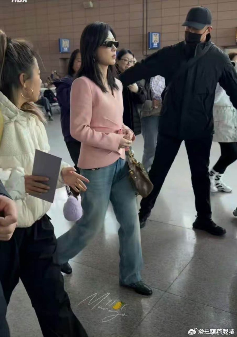 刘亦菲这条裤子挺养生,毕竟降温了肚脐眼必须护住啊