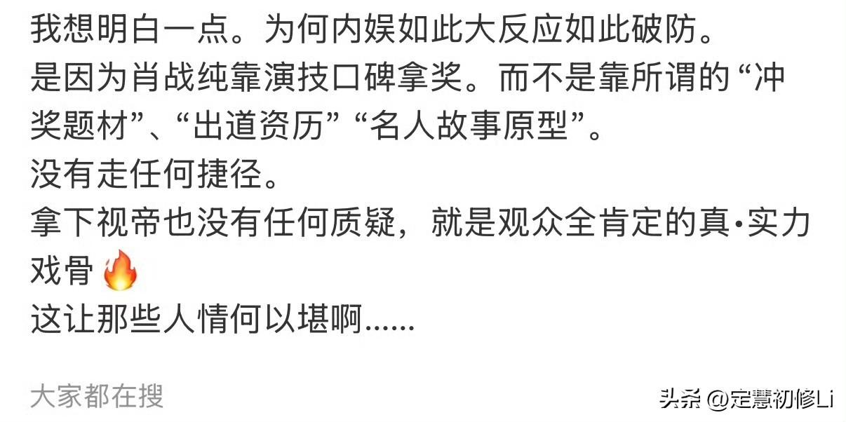 这个营销号说的没错啊,不演这些冲奖题材一样可以拿奖,才是真正的实力,才是对演员事业有追求的人。 所以千万不要被人PUA,什么转型,什么扮丑,肖战从不需要,他只是为了角色符合的妆造,涂黑不代表丑,顾一野,张小凡,莫得闲,郭靖涂黑了还是一样帅,一样吸引了大批观众粉丝。肖战有自己的职业规划,肖战喜欢挑战不同类型角色,绝不会墨守成规,也不会为了目的去演绎什么角色,他要是真是那么容易妥协和现实的人,20年就不会被全方位围剿了。所以尊重肖战的选择,相信他,爱他就够了。他走到今天靠的是自己,不是粉丝,粉丝是锦上添花,成功时为他喝彩呐喊,被黑时替他反黑,日常好好欣赏作品,夸夸夸就对了,自己的孩子一定要多夸
