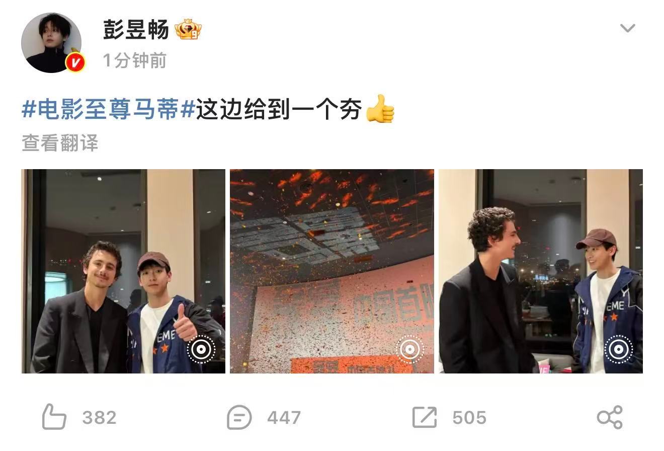 彭昱畅甜茶一起合照了彭昱畅甜茶合照给到一个夯 3月11日,发文晒和甜茶一起合照,