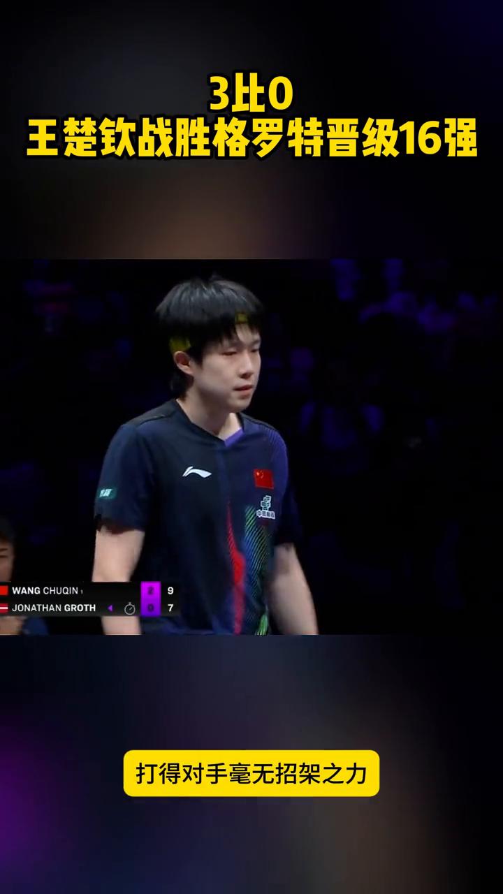 3比0,王楚钦战胜格罗特晋级16强。 恭喜王楚钦取得开门红。WTT重庆冠军赛男单1/16决赛,王楚钦3:0横扫格罗特,轻松晋级16强。单局轰出11:3,打得对手毫无招架之力,20分钟光速下班,王楚钦太强了。