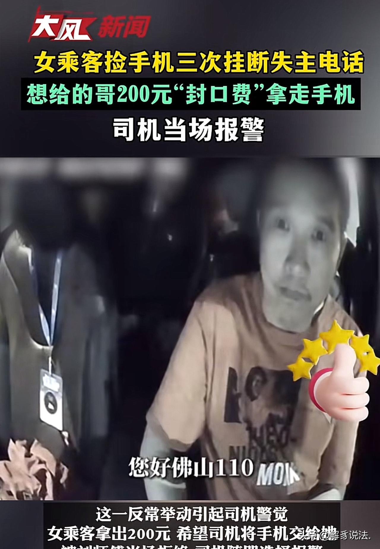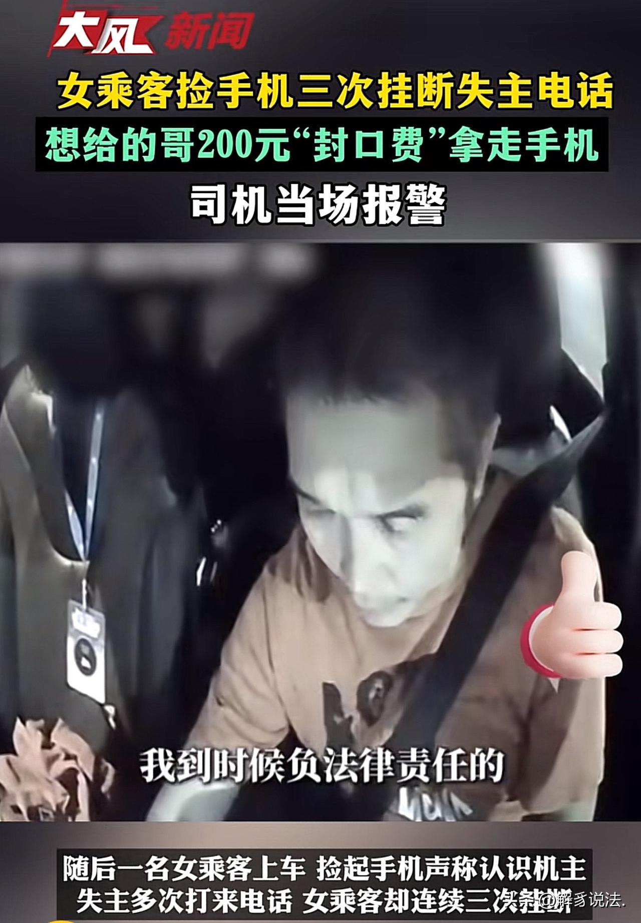 广东佛山,男子是一名出租车司机,一日,他拉了一女乘客。女乘客坐在后排座位上,手里的手机响个不停,她不接一直挂断,男子敏锐的察觉到不对劲,断定手机是上一位醉酒乘客落下的。于是,他赶紧询问女乘客,手机是否是她的。女乘客支支吾吾,说手机是她同小区的,回头还给对方,还提出给男子200元钱的封口费,让他睁只眼闭只眼,当没看见。出乎意料的是,男子这样做了。 刘师傅是一名出租车司机,每日风里来雨里去,只为给家人更好的生活。 刘师傅热心肠,待人真诚,做事更是堂堂正正,从不肯占别人半点便宜。 3月5号那天傍晚,天有点凉了,刘师傅接上了一名男乘客。对方看着喝得挺多,不过还能报出地址,刘师傅就正常开车。 结果半路上,男乘客突然难受起来,一个劲说想吐。刘师傅一听,立马靠边让他下车透透气。 谁知道这乘客一下车,就迷迷糊糊把那儿当成了目的地,怎么拉都不肯再上车,扭头就走。 刘师傅这才发现,那十几块钱车费对方还没付,心里虽有无奈,但转念一想,钱不多,人家也喝成这样了,也就没追。 刚忙完这一单,刘师傅又接上一名女乘客。他心里暗想着,这一单可得顺顺利利的,别再像上一趟一样白跑了。 没开多久,后排突然响了手机铃声。刘师傅一瞧,是上一个醉酒乘客落在车上的。 再看后座的女乘客,竟然直接把电话挂了,神色还很慌张。刘师傅心里一紧,下意识从后视镜多瞟了几眼,好家伙,这女乘客在那儿偷偷输密码解锁手机呢,试了好几次都失败了。 刘师傅心里立马有了数:这手机肯定不是她的。 他开口问了一句:美女,这手机好像不是你的吧? 女乘客吓了一哆嗦,嘴硬道:是我一个小区的人的,我待会儿就还给他。 刘师傅一听就乐了,这谎话太拙劣了。 要是真熟人,怎么可能不接失主电话,又偷偷摸摸解锁呢?他当即表示:那还是我来保管,等会儿我直接还给失主。 这话一下惹恼了女乘客,她翻了个白眼,压低声音凑过来:大哥,你一天跑车也挺累,我给你200块,你就当没看见,行不?” 刘师傅想都没想就拒绝了。 200块确实能补上刚才那单亏的车费,但这钱烫手啊。他心里明白,做人得有底线,不是自己的东西,别说200,给2000也不能动歪心思! 眼看女乘客死活不愿意交手机,刘师傅不想跟她多纠缠,直接拨通了报警电话。 等到警察一到,女乘客没辙了,只好乖乖交出手机。 后来失主拿回手机,他老婆感动坏了,非要给刘师傅包个红包感谢他。 刘师傅坚决没收,朴实地笑了笑说:咱就是个开出租车的,看好乘客的财物,这都是应该的。 《民法典》第314条规定:拾得遗失物,应当返还权利人。拾得人应当及时通知权利人领取,或者送交公安等有关部门。 本案中,醉酒乘客遗落的手机属于遗失物,女乘客明知非己所有,仍私自解锁、拒接来电,还试图用200元封口,意图非法占有,明显违反上述法律规定,负有法定返还义务。 刘师傅发现后主动保管、拒绝利诱并报警,既履行了承运人对乘客财物的保管责任,也符合拾得遗失物的法律要求,合法合规。 若女乘客拒不交还且手机价值较高,还可能涉嫌《刑法》第270条侵占罪,需承担相应法律责任。 欢迎关注@解豸说法.