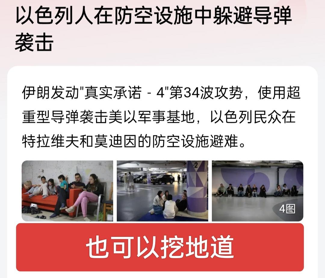 面对伊朗的多轮导弹袭击,以色列的防空神话早就被击碎了,以色列人以后要习惯在防空设施内生活了,当然了,还可以自己挖地道。 当地下空间成为生存常态,孩子们在避难所里玩耍,成年人靠弹吉他、跳肚皮舞缓解焦虑,这种“苦中作乐”的背后,是对和平的绝望与对强权政策的无声控诉。以色列长期以来的扩张与挑衅,终究让本国民众付出了代价,所谓“安全屏障”在自身引发的仇恨面前不堪一击。或许只有放弃霸权思维、回到谈判桌前,才能让以色列人走出防空洞,让中东地区重拾安宁。