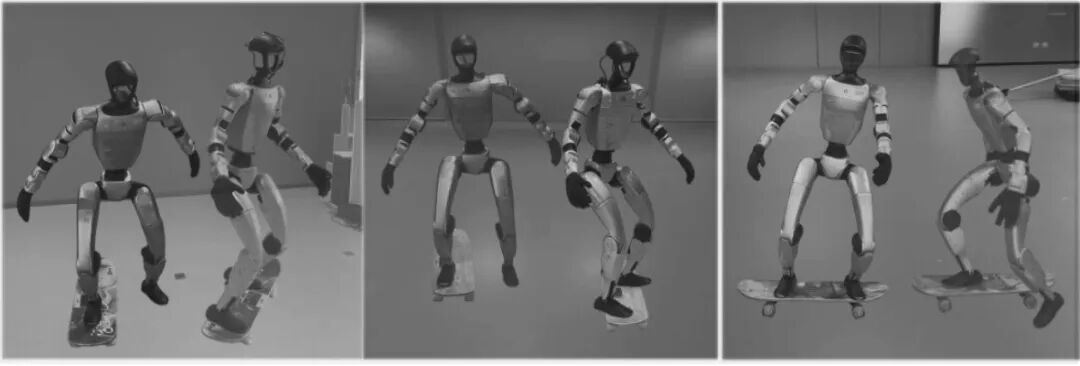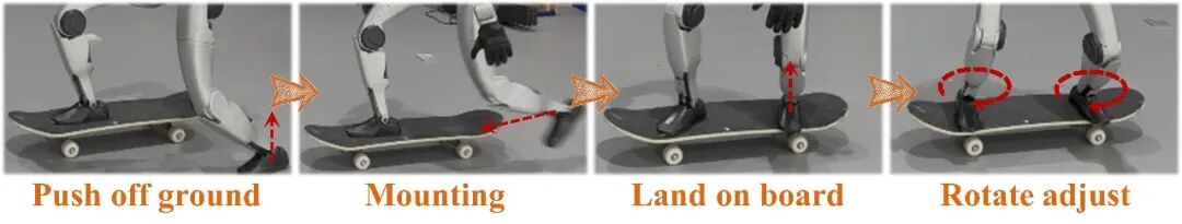 研究人员只能通过 最先进的算法和模拟器来处理这些复杂的动力学问题。 上面两张图是研究过程中, 人形机器人的“ 关键身体姿态参考”和多种滑板测试实验。 这篇论文的发表,包括开头的视频,其实都说明了目前研究取得了一 定进展。 目前 人形机器人可以:稳定站在滑板上,起步并蹬板持续滑行,并控制方向。