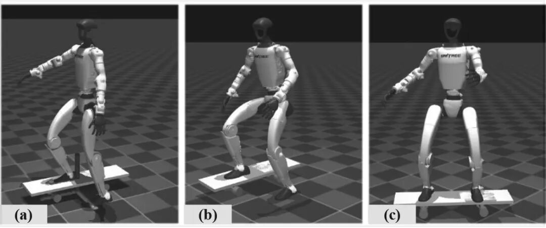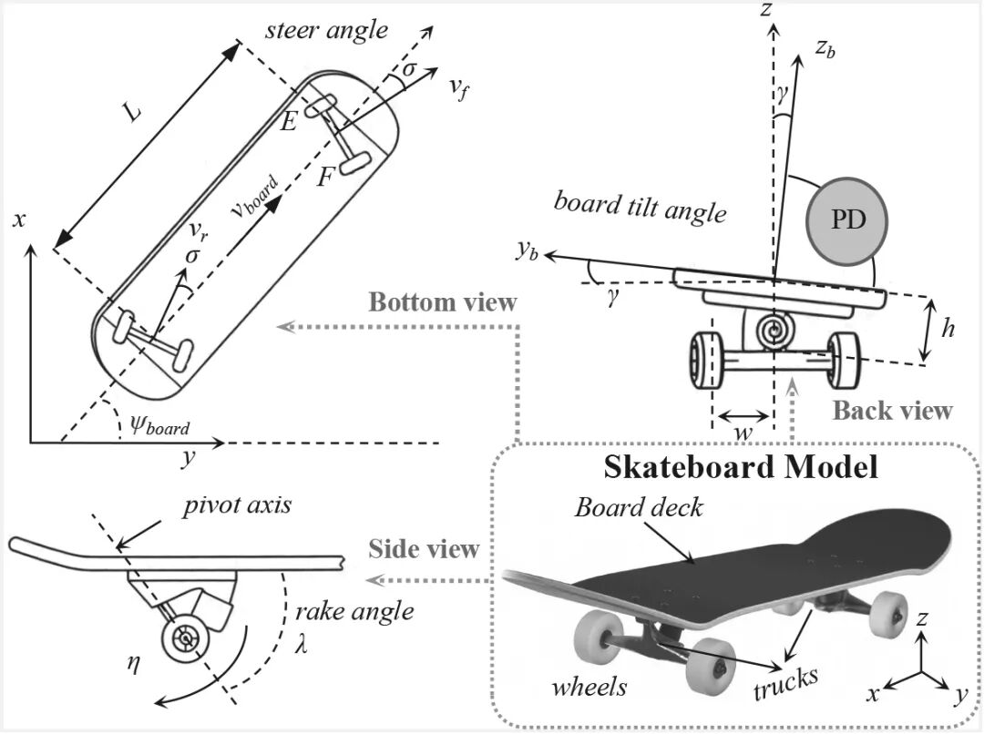 对于研究人员来说,他们并没有把 人形机器人和滑板分开看,而是视作一个整体。从某种意义上说,他们真正做到了“人板合一”。 上图展示了他们对于蹬板加速过程中的整体运动和腿部细节变化。 该图展示了 人形机器人和滑板之间的影响。 道理说起来很简单,蹬板的时候重心要跟上,不然会摔跤;滑行的时候失去平衡也会摔跤,而拐弯压得不够,无法转向,压多了也会失去平衡……