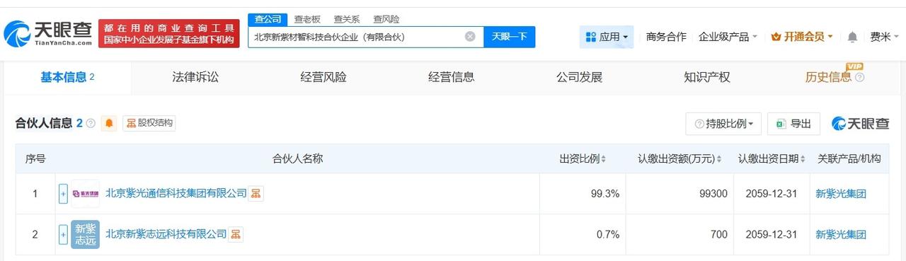 紫光集团成立新科技合伙企业 出资额10亿 天眼查工商信息显示,近日,北京新紫材智科技合伙企业(有限合伙)成立,执行事务合伙人为北京新紫志远科技有限公司,出资额10亿人民币,经营范围包括信息技术咨询服务、数字技术服务、互联网数据服务等。合伙人信息显示,该合伙企业由北京紫光通信科技集团有限公司及其旗下北京新紫志远科技有限公司共同出资。 天眼查信息: