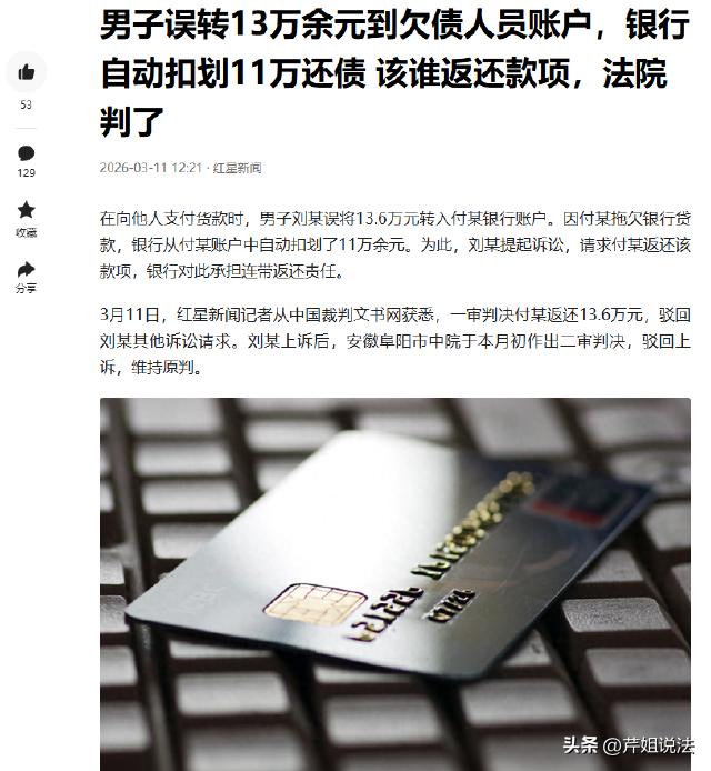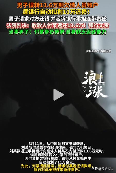 安徽阜阳,男子想给合伙人转一笔13.6万的货款,结果一不小心转给了付某,巧合的是付某拖欠了贷款,钱刚转过去就被划走了。男子要求付某还钱,可付某说钱是某支行转走的,让男子找支行要,双方扯起了皮,男子无奈起诉付某,要求他还钱,还把该支行列为了被告,要求承担连带返还责任,判决结果男子肠子都悔青了。 刘某和老付是长期的合作伙伴关系,去年的7月30号,刘某给老付转货款,一共136000块钱。 刘某通过手机银行转完钱后,给老付发信息问他收到了没有,老付很快回信息,说根本没有看到钱。 刘某大吃一惊,直呼不可能,还给老付发去他的转款截图,说刚刚明明已经提示转账成功了。 老付看了一遍后,立马提醒刘某,说刘某转错了,那个人根本不是他。 刘某仔细一看,发现自己真的转错了。 原来,刘某之前和付某之间有过经济往来,给老付转账的时候,刘某看到有个姓付的,就以为是老付,没有思考就把钱转过去了。 幸亏这个付某是认识的,李某立马联系他,告诉他自己转错了账,请求他把钱还回来。 可是付某的一句话,直接让李某感觉天都塌了。 原来这个付某近两年经济不太好,生意也垮了,还欠了不少债。 之前付某曾经贷款十几万,因为还不上钱又输了官司,最后被强制执行了,付某还了一部分之后,还剩下11万多一直没还上。 李某的钱刚转过去,就被划走了11万余元。 付某对李某说,他可以把剩余的1万多块钱还给李某,但是他这11万多他也没有办法,让李某自己找划走钱的支行要。 李某顿时急了,这笔钱他是转给付某的,既然偿还的是付某的债务,自然也要由付某来还。 可是付某说来说去就是一句话,没钱,李某想要钱,就找划走他钱的某支行。 李某和他扯皮了很久,钱还是没有要回来。 李某只好又找到划走钱的某支行说明情况,并要求他们把这笔钱退回给自己。 可是该行却说,付某欠了他们的钱,还款是天经地义,他们从付某的账户里划走现金偿付某欠他们的债务,程序上没有任何问题。 至于李某转错账的事,这是他和付某之间的纠纷,要钱也应该找付某要,些事和自己无关。 李某腿都快跑断了,可是付某把这事推给支行,支行又把这件事推给付某,双方谁也不愿意承认是自己的问题,谁也不愿意还钱。 李某只好另外凑钱付给老付货款,可是一来二去,他的生意受到了很大的影响,还平白损失了十几万。 走投无路之下,李某起诉了付某,要求他偿还自己错转给他的13.6万,并要求某支行承担连带返还责任。 那么,错转的钱被划走,责任究竟在谁? 刘某转错账,是否构成不当得利? 刘某本意是转给老付货款,却因疏忽转给付某,付某获得这笔钱没有合法依据,属于不当得利。 根据《民法典》第985条,得利人没有法律根据取得不当利益的,受损失的人可以请求得利人返还。 付某理应返还全部款项,可因钱被划走,他只愿还剩余部分,这明显违背了法律规定。 支行划走钱,是否合法? 支行称付某欠债,从其账户划钱还款程序没问题。 但问题是,这笔钱是刘某错转的,并非付某合法财产。 支行在未核实资金来源和归属的情况下就划走,侵犯了刘某的财产权。 银行在处理此类业务时,有义务对资金性质进行审查,不能简单以债务关系就随意划扣。 判决可能依据不当得利返还原则,判付某返还剩余款项,认定支行划扣行为存在过错,承担相应赔偿责任。 综合以上分析,付某应返还刘某13.6万元不当得利。 支行虽在自身与付某的债务关系中扣划行为程序上无明显不当,但若存在未尽合理注意义务等过错情况,可能需承担一定补充责任,而非连带返还责任。 最终,法院经审理认为,付某构成不当得利,应返还刘某13.6万元。 刘某对一审不服,提起上诉。 3月3日,二审驳回上诉,维持原判。 您觉得在这种情况下,银行是否应该承担全部赔偿责任呢?
