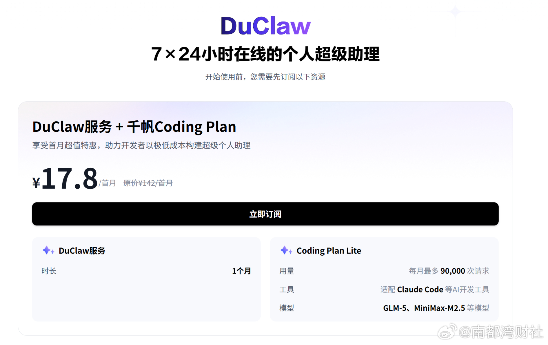 南都记者实测,可通过网页端直接使用DuClaw。据了解,后续该产品还将陆续支持企业微信、钉钉、飞书等主流通讯应用。从价格来看,百度智能云同步开启了3月限时活动,首购用户仅需17.8元/月即可享受原价142元的服务。此外,官方托管的零部署方式也有助于用户避免因自行安装配置不当带来的潜在使用风险。