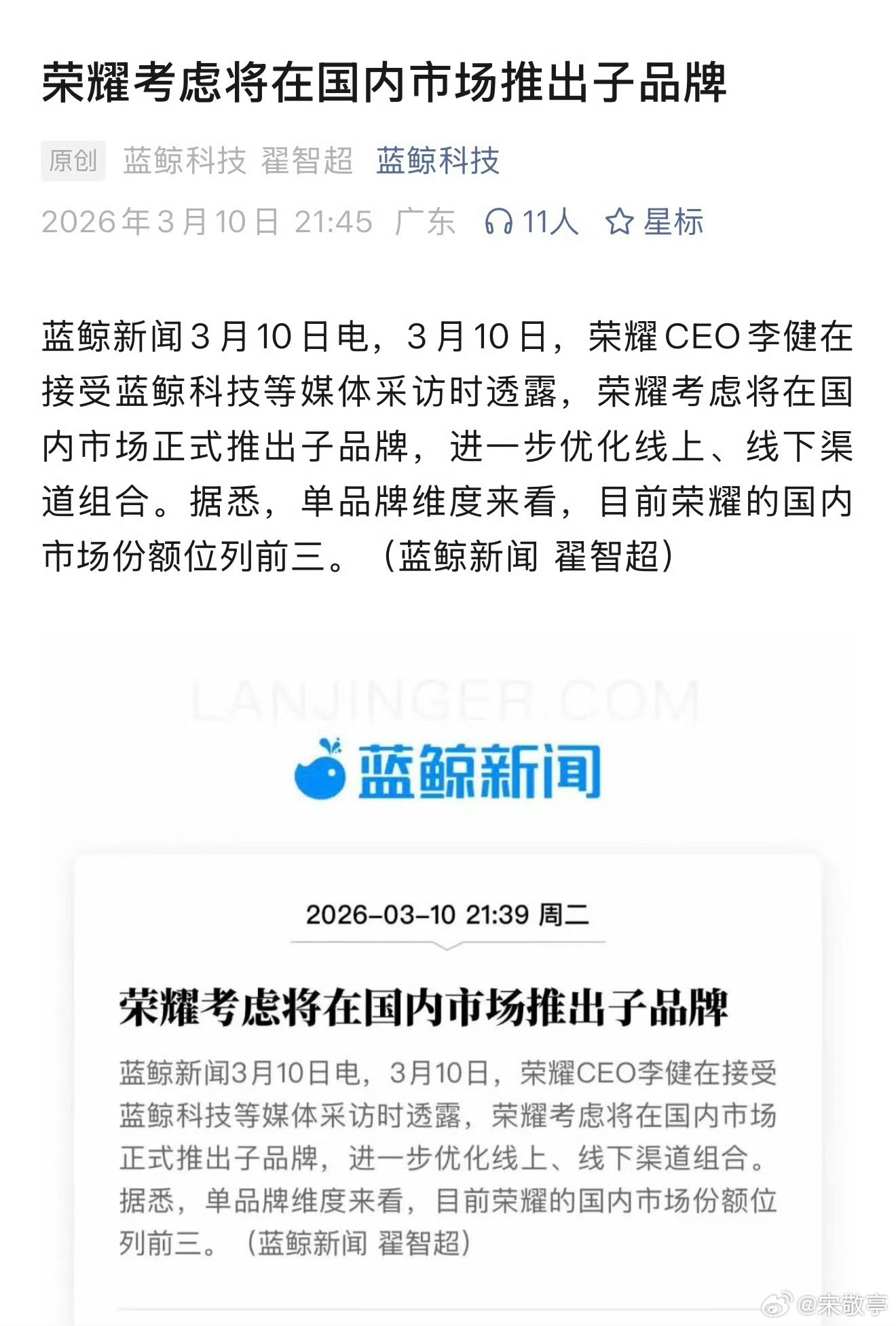 荣耀考虑将在国内市场推出子品牌,进一步优化线上、线下渠道组合,大家觉得叫什么合适?荣耀李健说荣耀折叠屏是最好的