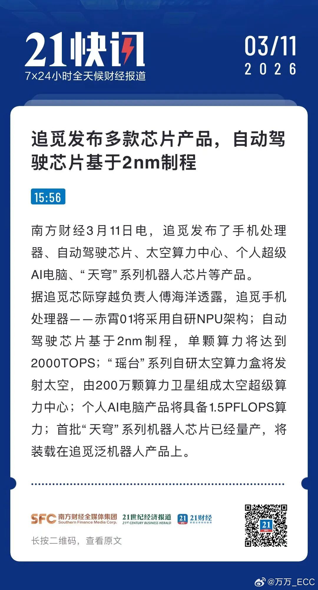 据追觅芯际穿越负责人傅海洋透露:追觅手机处理器——赤霄01将采用自研NPU架构;自动驾驶芯片基于2nm制程,单颗算力将达到2000TOPS;“瑶台”系列自研太空算力盒将发射太空,由200万颗算力卫星组成太空超级算力中心;个人AI电脑产品将具备1.5PFLOPS算力;首批“天穹”系列机器人芯片已经量产,将装载在追觅泛机器人产品上。