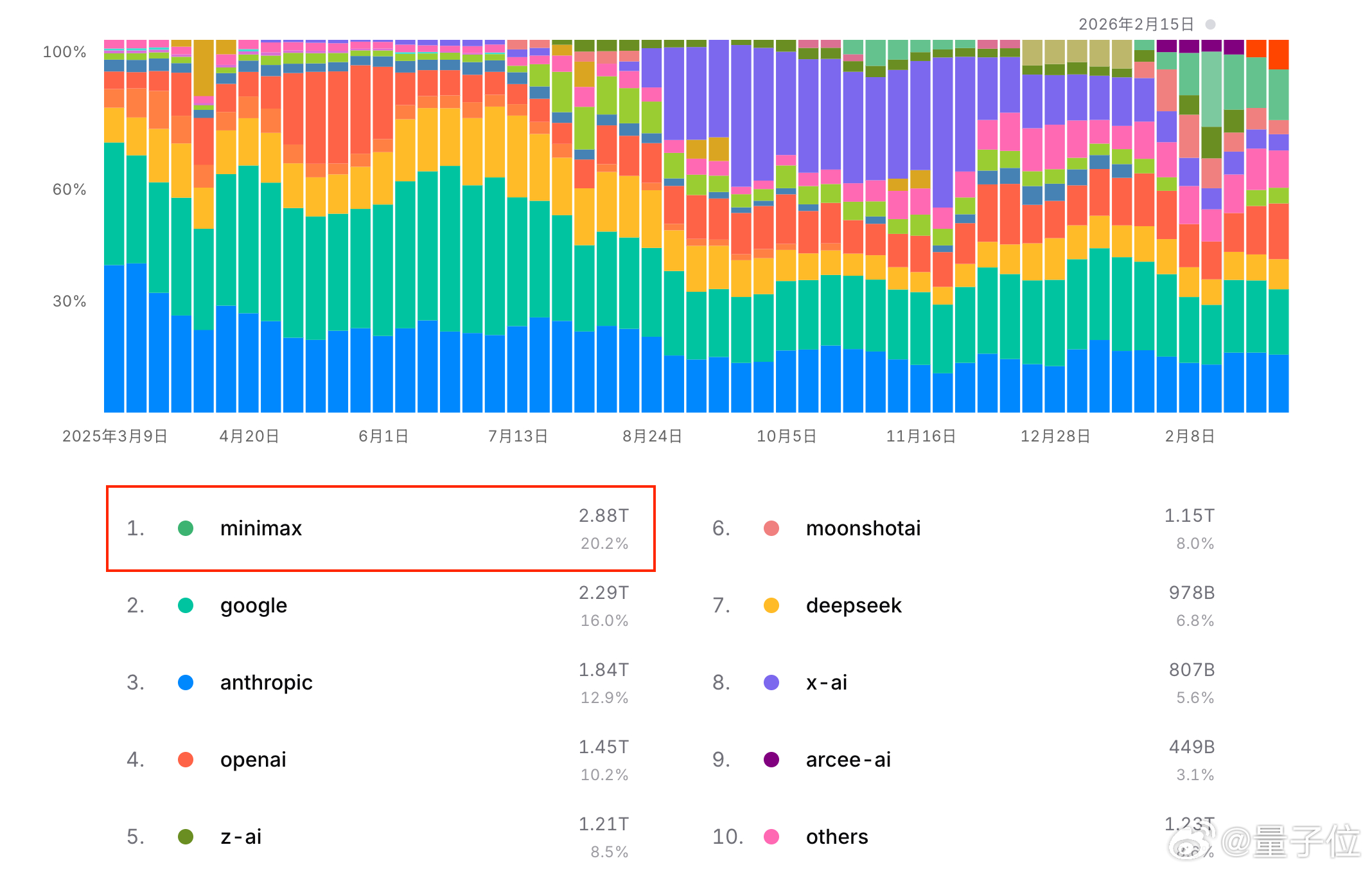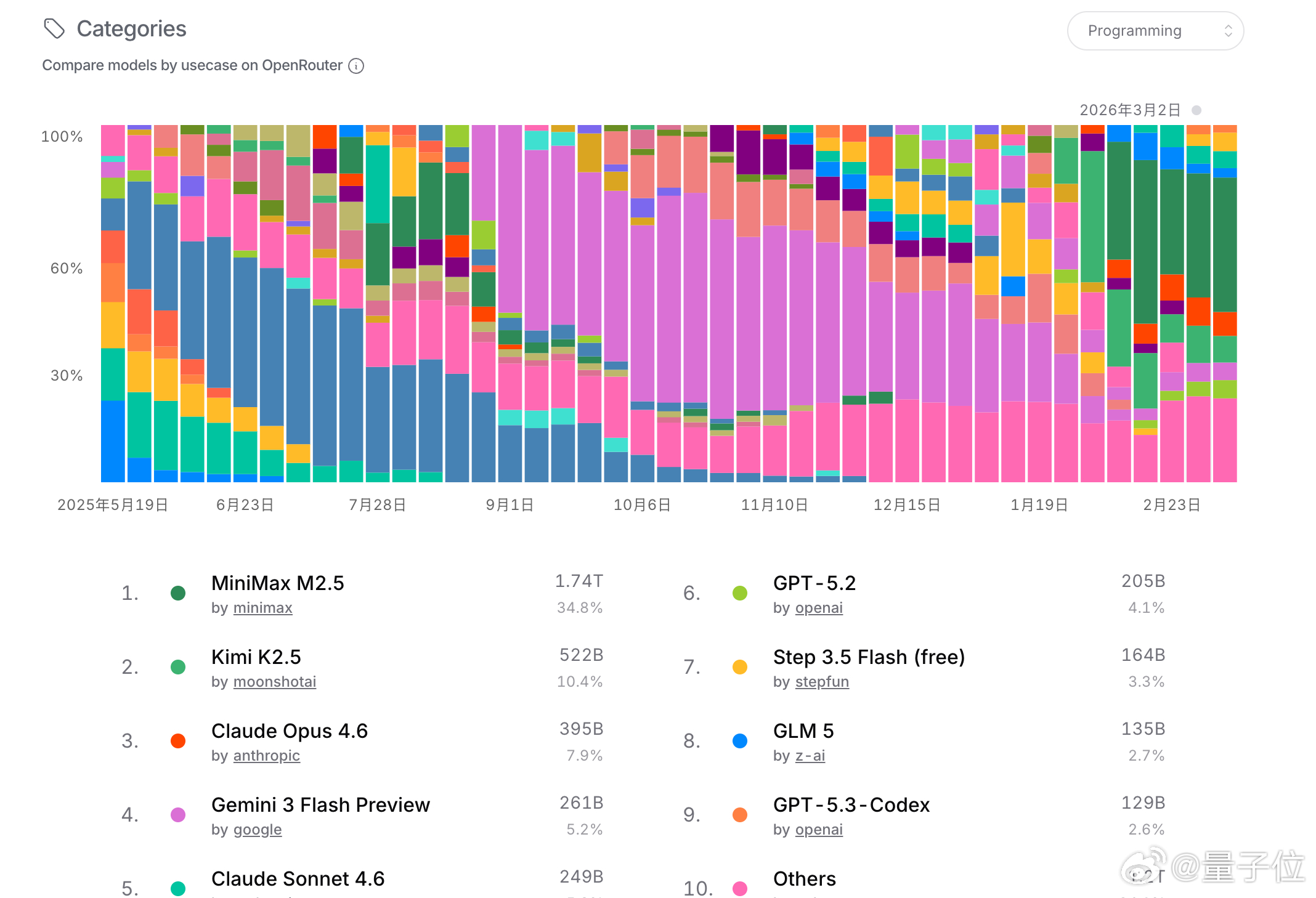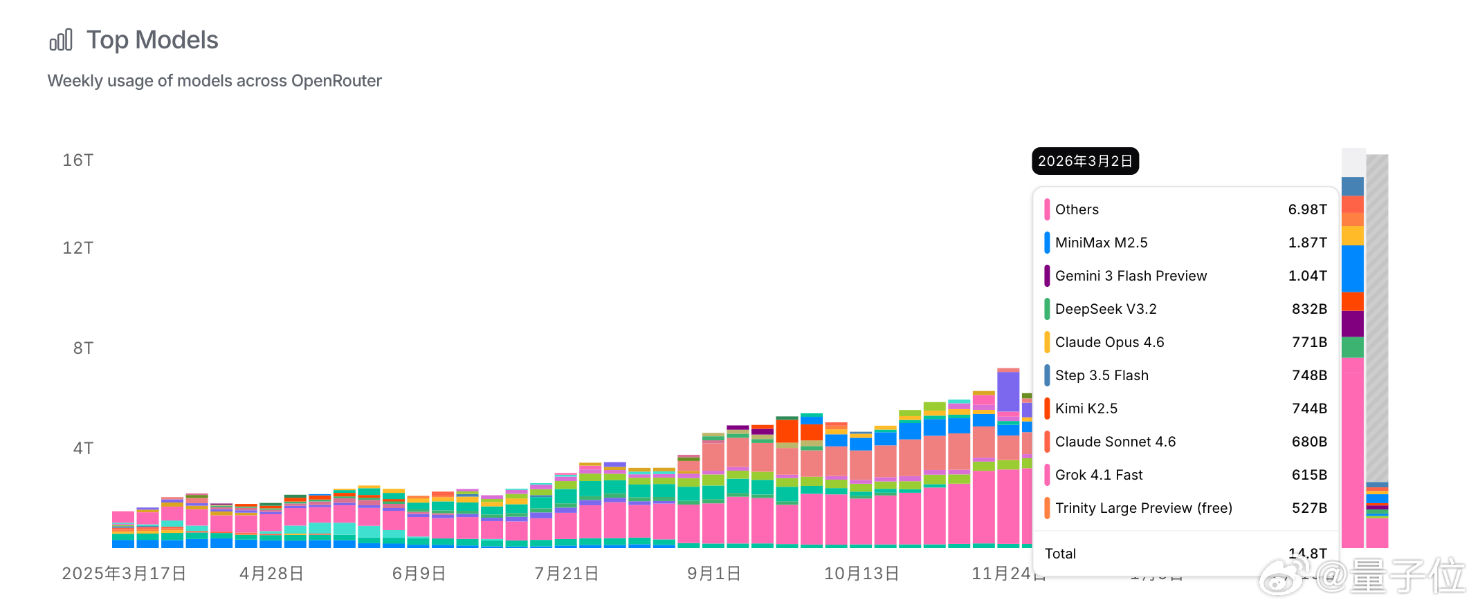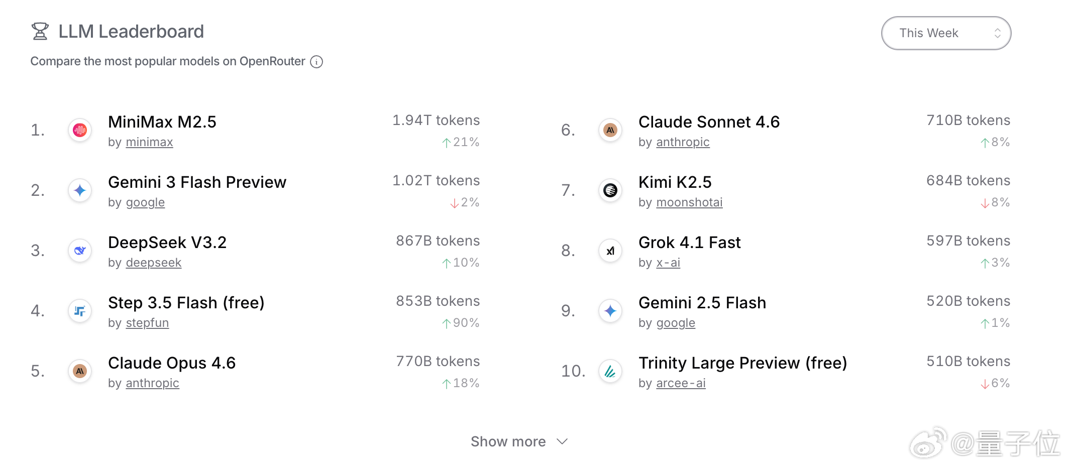 榜单前三分别是Kimi K2.5、Step 3.5 Flash和MiniMax M2.5,均超1T tokens。