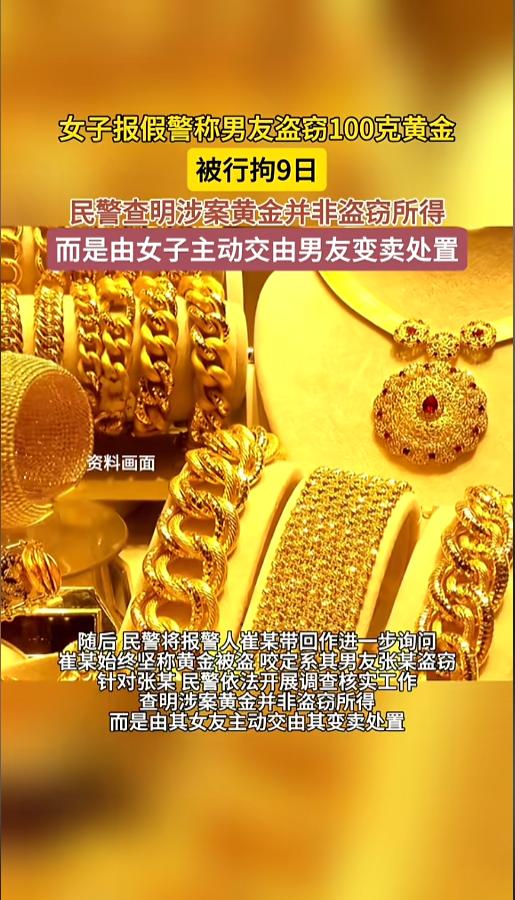 “离了个大谱!”近日,河南,一女子向警方报案,说自己卧室里的100克黄金不见了,怀疑是被自己的男朋友偷的。警方到现场调查后,发现没有破坏痕迹,初步也判断为熟人作案。当警方展开进一步调查后却发现,黄金竟然不是被偷了! 最近一段时间,国际局势持续动荡,黄金的价格也水涨船高,一个普通的镯子都得好几万块,可不是一个小数目了。黄金的保存也显得更加重要起来。 据媒体3月9日报道,事发当日,崔女士报警称,自己丢了100克金子,原来就放在卧室的,现在却不见了。同时,她还告诉警方,怀疑是自己的男朋友张某偷的。 警方接到报案后,很快到现场进行了勘察。他们发现,崔女士家里,没找到任何暴力损坏的痕迹,初步判断也是熟人作案。警方又对崔女士询问,崔女士坚称,黄金就是丢了。 于是,警方开始对崔女士的男友张某展开了调查。这一调查不要紧,发现事情和崔女士宣称的有些不一样。调查发现,张某确实变卖了一批黄金,但却不是偷的,而是崔女士主动给的。 随着调查审问的逐步推进,真相也渐渐浮出了水面。原来,不久前,崔女士把自己的黄金交给了男朋友,让他卖了变现周转。后来,两人感情出现了纠纷,崔女士就去找他,想要回黄金,但是没有成功。 一气之下,崔女士就报了警,谎称自己的黄金被男朋友偷了。真相大白后,崔女士也因为报假警被拘留了9天,得不偿失。 网友看后表示,感情出现问题,解决就是了。就算是彻底破裂了,想要回黄金,完全可以报案或者起诉,直接说明自己的诉求,为什么要诬告呢?害人终害己! 信息来源:《女子报假警称男友盗窃100克黄金:被行拘9日(九派新闻)》半岛晨报