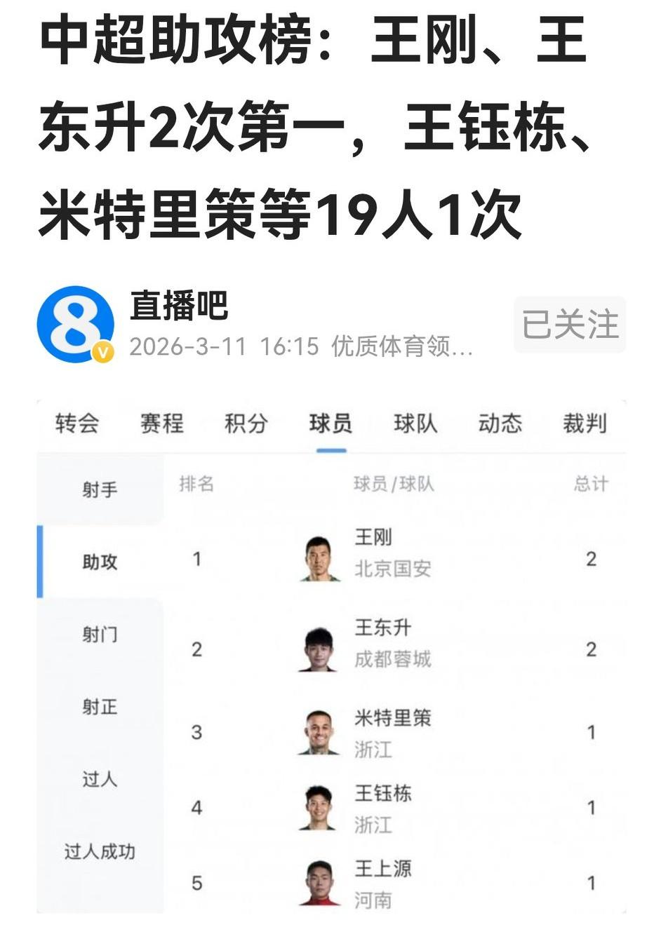 现实就这么打脸,在蓉城和国安饱受争议的边后卫王东升和王刚,当下正以2球领衔中超助攻榜。 蓉城球迷普遍认为王东升打右后卫是最大短板,国安球迷更称王刚只是打架的“榜样”。但两队换了阿洛伊西和蒙哥马利两位澳洲教练后,这二位老将竟以主力身份成为能攻善守的大将。 首战2助的亮眼数据,不仅是对新帅的回报,还顺势反手给喷子们一巴掌。首轮赛后王东升说“可以继续喷我,我会继续做好自己”,可以说是信心大涨。 当然,新赛季刚起步,赛程还很漫长,如果王东升与胡荷韬(首轮有进球)两名边后卫能续写两翼齐飞传奇,定能改变在蓉迷心中的形象。