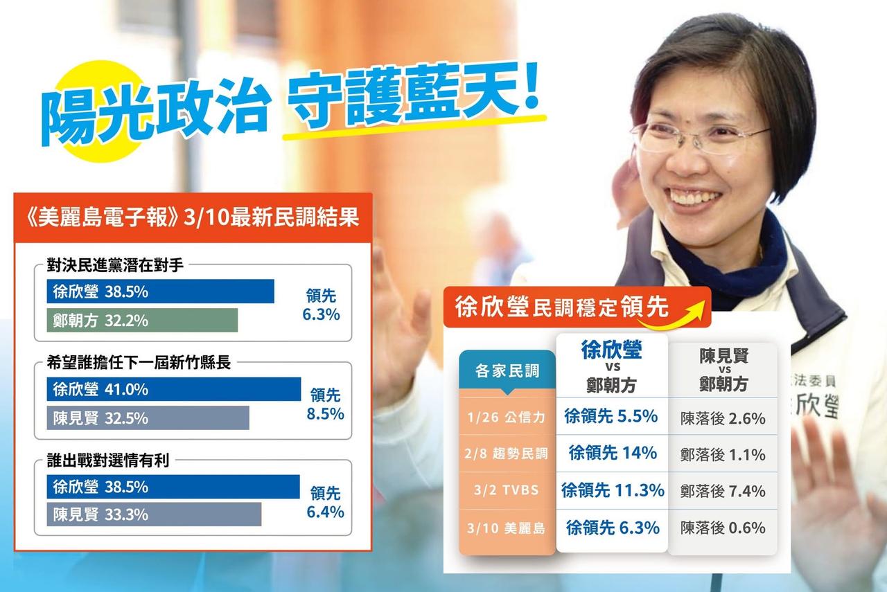 国民党立委、新竹县长参选人徐欣莹今(11日)在脸书发文表示,看到新的民调结果,心中除了感谢,更感受到一份沈甸甸的责任。这段时间,各种谣言与抹黑没有停止过。但从不同时间点的民调来看,无论是与民进党潜在对手的对决支持度,或是党内谁适合代表出战,乡亲的支持始终稳定,这份信任,欣莹会一直记在心里。