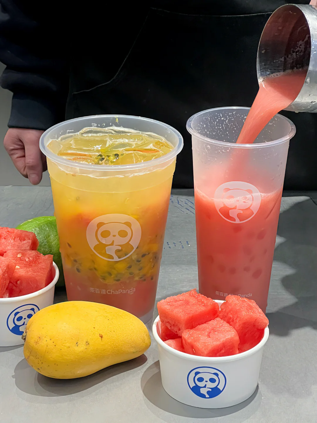 路过茶百道差点以为误入水果店🍉 店员切水果切到手速起飞,用料是真实在啊,每一块都又厚又大块! 那个西瓜上一秒还完整的,下一秒就在杯子里躺平了,馋的跟闺蜜立马三杯都拿下