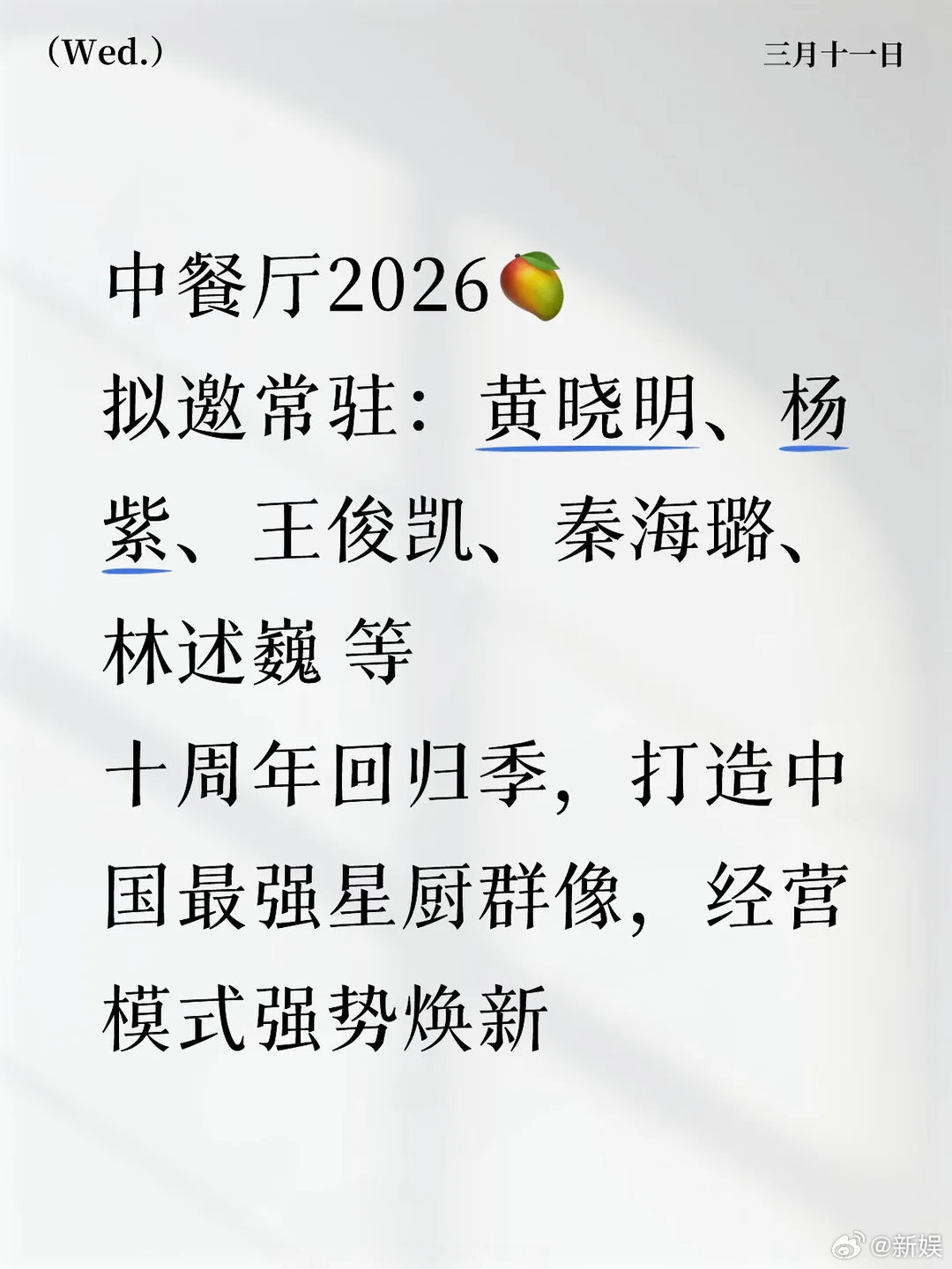 中餐厅2026阵容网传中餐厅2026阵容 网传2026新一季《中餐厅》主题是十周年回归季,所以阵容包括黄晓明、杨紫、王俊凯、秦海璐、林述巍等~那就等一波回忆杀了!新娱
