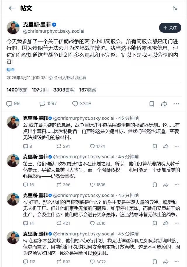 美伊以冲突 从战术层面,美军无疑是非常成功的,摧毁了伊朗海军、空军、绝大多数的导弹发射装置、导弹生产设施。。。但是,战略上确实一团浆糊。不过克里斯·墨菲是民主党的参议员,可信度还是要打个折的。