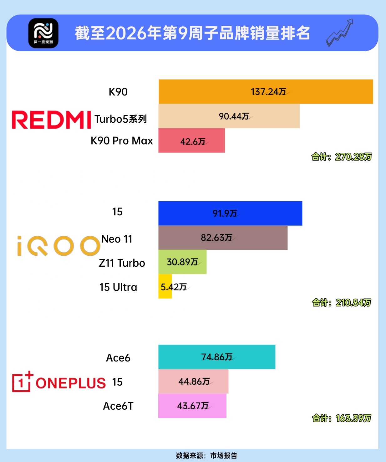 潮水退去,方知谁在裸泳。2026年第9周手机子品牌销量数据,清晰勾勒出市场格局的剧烈分化红米以270.28万主力机型合计销量稳居榜首,iQOO紧随其后达210.84万,而一加163.39万的销量与之拉开差距,真我则因未披露数据前途未卜。历经市场考验与供应链涨价浪潮,曾经百花齐放的子品牌大俨然战落幕,“子系旗舰只看红米和iQOO”已成为不争的事实。红米和iQOO均已普及百瓦快充与大电池长续航,夯实子品牌市场根基,但产品布局各有侧重。红米主打全能均衡与生态协同,背靠小米生态,覆盖全价位段,兼顾性能、影像与日常体验,以“普惠科技”理念吸引广泛消费群体,凭借稳定供应链与线上渠道优势,筑牢大众用户心智。而iQOO的核心竞争力的在于极致的专注度,深耕性能与电竞赛道,形成差异化优势。其产品普遍搭载独显芯片,专注电竞优化,搭配全时四区散热等配置,精准贴合游戏用户需求。更值得关注的是二者在旗舰市场的表现。截至到第九周,iQOO 15系列销量接近百万,已媲美部分主品牌旗舰;而红米旗舰K90 Pro Max销量仅突破40万,iQOO旗舰销量是其两倍还多。这种差距源于iQOO的品牌专注度——始终聚焦性能核心,从旗舰到中端机型均围绕电竞体验优化,形成清晰的品牌标签,而红米旗舰则受限于“性价比”固有印象,高端突破受阻。iQOO凭借对性能赛道的专注、精准的产品定位,不仅在子系品牌市场站稳脚跟,更在旗舰领域实现对红米的反超,其核心优势在于不追求全能,而是将电竞与性价比做到极致,成为子品牌中最具竞争力的存在。vivo