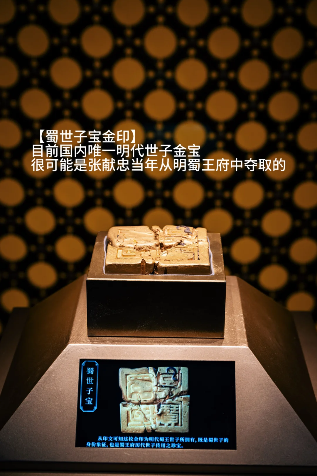 ❶蜀世子宝金印:目前国内唯一明代世子金宝,很可能是张献忠当年从明蜀王府中夺取的,金印是碎的,很可能是张献忠当年为填补军饷而人为切割所致。
