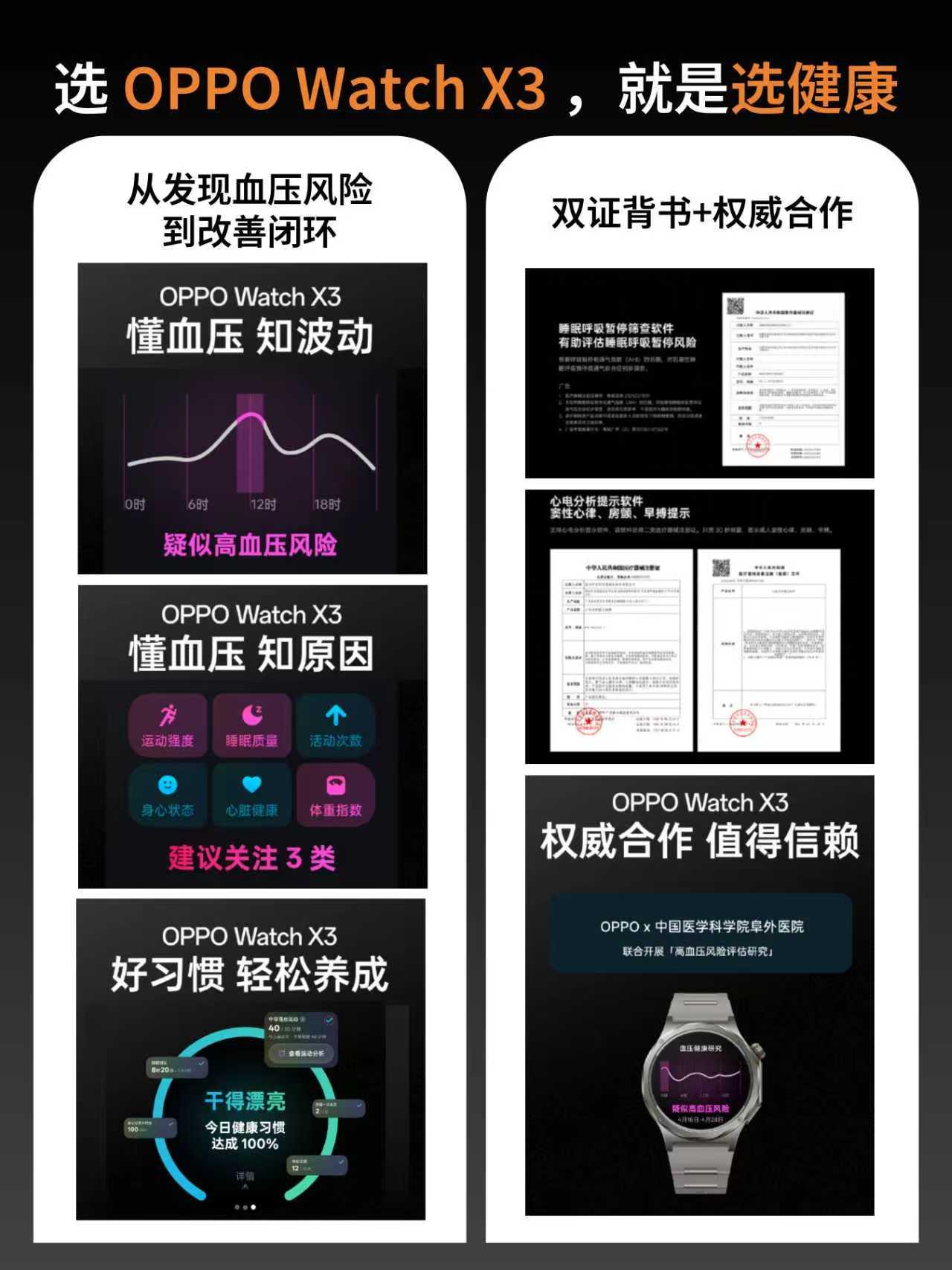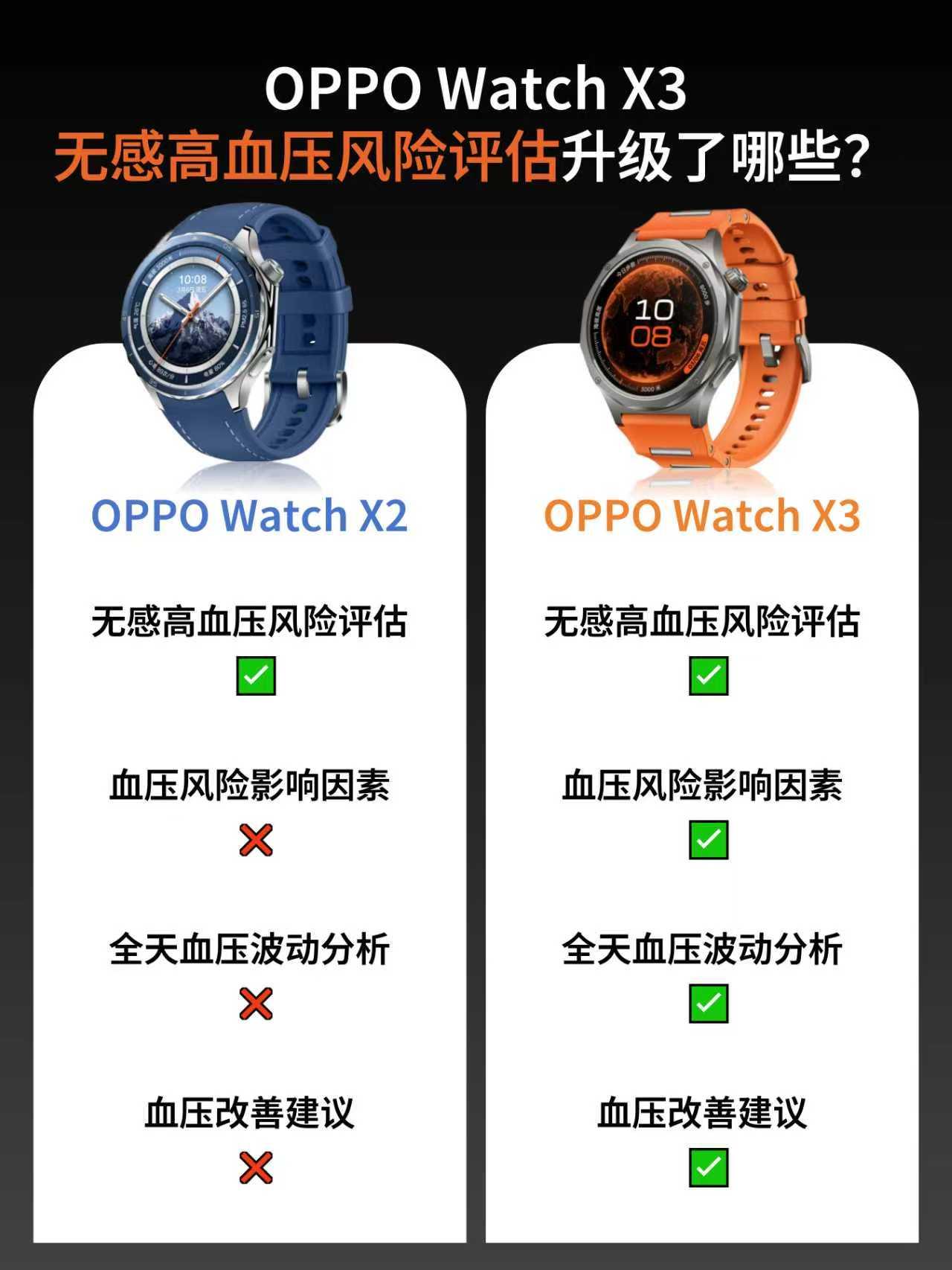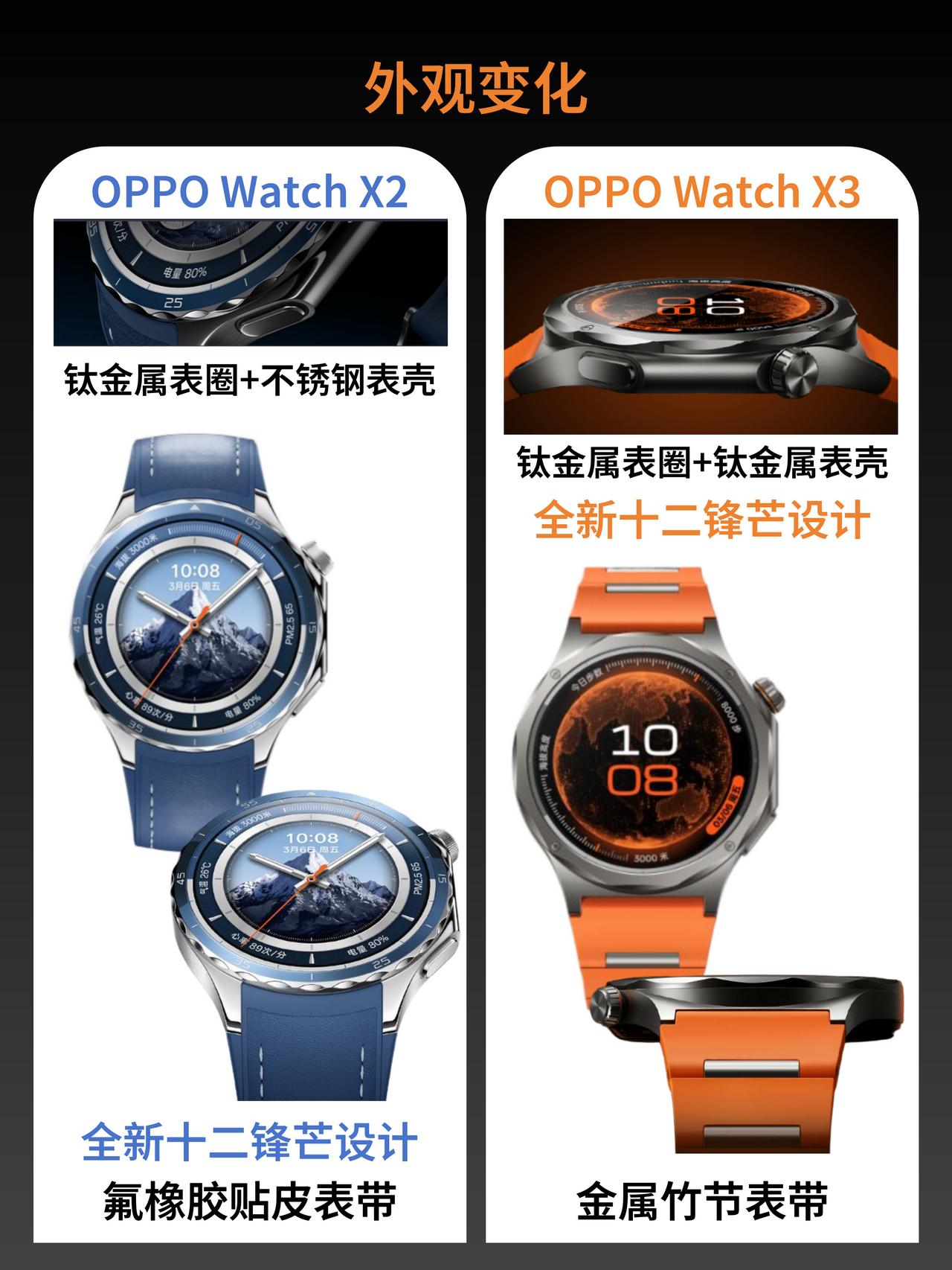 安卓表皇稳了?OPPO Watch X3比X2升级了啥 最近一直在琢磨换块智能手表 看了一圈,被⌚️OPPO Watch X3种草了 正好官方爆料陆续出来 跟前代X2对比了一下,你想知道的都在这 对比Watch X2,X3核心升级很实在👇 ✅外观材质大焕新,从钛金属表圈+不锈钢表壳升级到全钛机身 更轻更薄,质感也直接进阶,佩戴无负担 推出三个色:寰宇星橙、无限钛、引力黑 还有舒适竹节表带,外观设计更精致耐看 ✅健康功能是重头戏 OPPO Watch X3升级无感高血压风险评估 不仅可以提前预测高血压风险,还能分析影响因素并且给出改善建议 对打工人更加友好 ✅防护耐用性这块也更硬核 OPPO Watch X3支持IP68+IP69满级防护 还通过了16项军规测试, X2是5ATM+IP68,X3直接拉满 - 不过我比较好奇 现在全钛智能手表普遍偏贵 💰OPPO Watch X2发售价2499元 现在有了全钛材质+高血压监测加持 🤔OPPO Watch X3会小幅上涨还是给咱们惊喜定价? - OPPO Watch X3