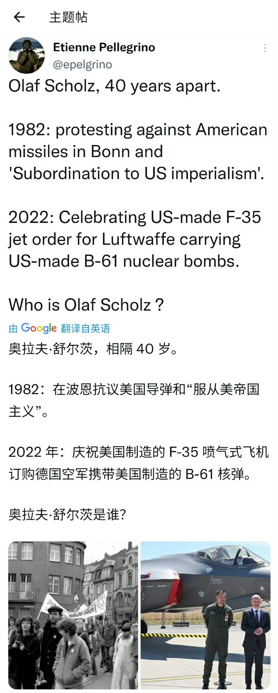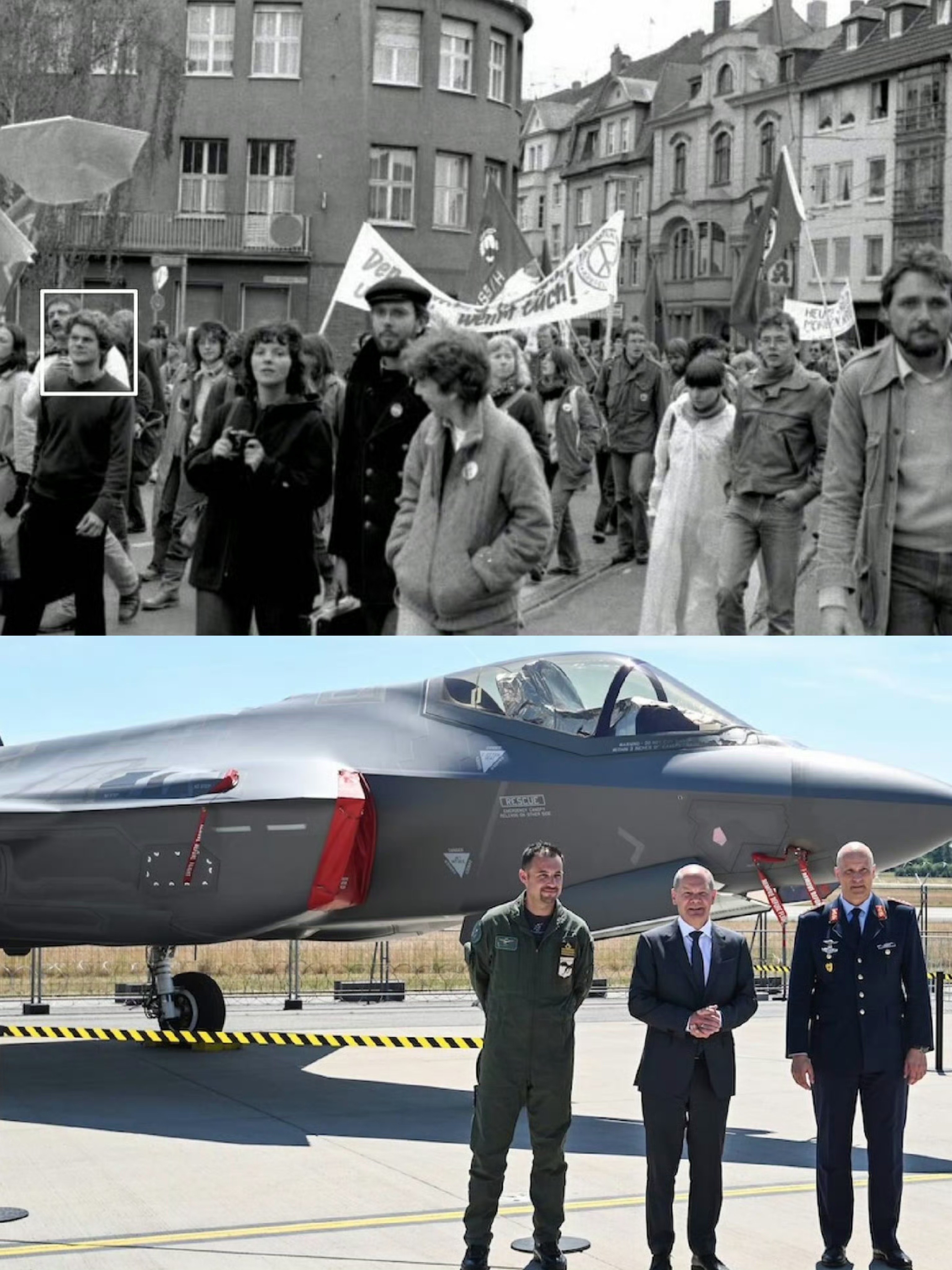德国前任总理奥拉夫·舒尔茨,相隔 40 岁。1982年:在德国波恩抗议美国导弹和“服从美帝国主义”。 2022年:庆祝德国空军采购美国制造的 F-35 喷气式飞机以携带美国制造的 B-61 核炸弹。