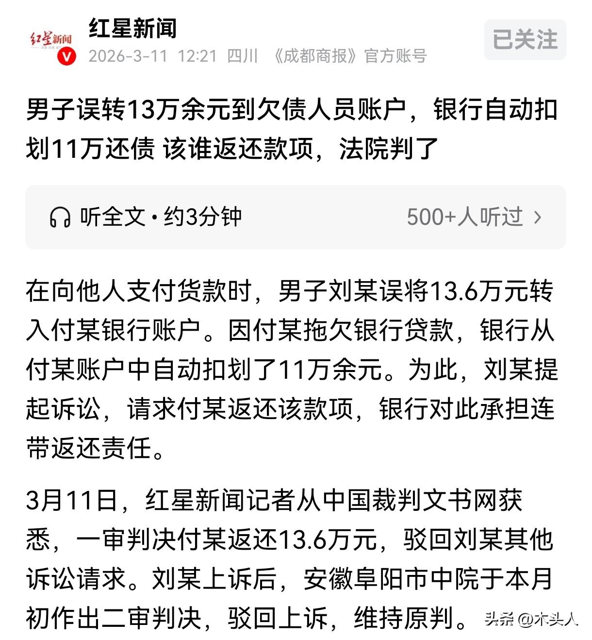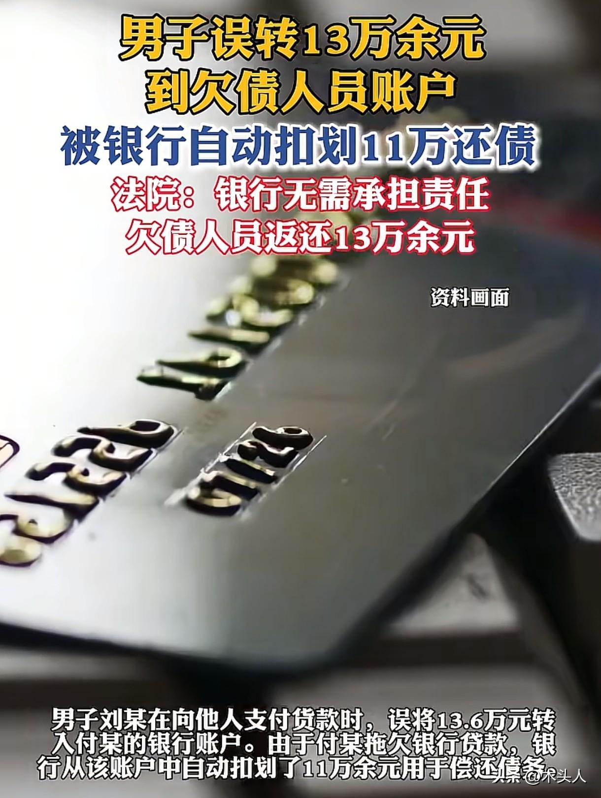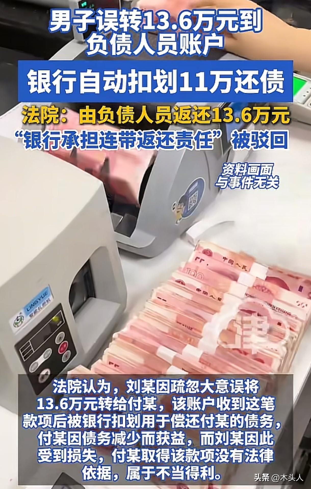 “这回和银行真没关系!”安徽阜阳,男子给合作商结算货款,却不小心把136000元转给了其他同姓的人,他联系对方,希望对方返还。万万没想到,对方欠着银行贷款,银行自动从他账户中划走了11万元,男子找对方返还,对方却让他去找银行,银行却称他们是按照合同约定划扣,并无不妥。男子见要钱无望,将对方和银行告上法庭,可法院判决结果让他失望。网友:银行为啥不用承担连带返还责任? 刘先生是做生意的,2025年7月30日,他像往常一样,给合作伙伴付某某结算货款,可没想到,他没仔细核对卡号和名字,直接把136000元货款转给了付某。 他和付某曾经也做过生意,转账记录里有对方的账户信息,发现转错账后,刘先生赶紧联系了付某,希望能够把钱要回来。 可万万没想到,付某却说这笔钱已经被银行划走了11万元,让刘先生自己去找银行要。 刘先生也懵了,联系银行,说明情况,得到的答复是付某欠了银行的贷款,银行按照合同约定,从付某账户里自动划扣了11万余元,清偿付某的贷款。刘先生应该去找付某要钱,而不是找银行要。 无奈之下,刘先生将付某和银行都告上了法庭,他要求付某返还这13.6万元不当得利,同时还要求银行对这笔款项承担连带返还责任。 所谓不当得利是指没有合法根据,取得不当利益,造成他人损失,受损人可以请求得利人返还取得的利益。 一审法院认为:刘先生因为疏忽把136000元转给付某,付某收到这笔钱后被银行扣划还了债,付某因为债务减少而得到了好处,可刘某却遭受了损失,付某得到这笔钱没有法律依据,这属于不当得利。 得利人没有法律根据取得不当利益的,受损失的人可以请求得利人返还取得的利益。 最终,法院判决付某应该把这136000元返还给刘先生,银行无需承担连带责任。 刘先生不服,提起上诉,要求银行承担连带清偿责任,可二审法院驳回了刘先生的诉求,维持了原判。 刘先生虽然心里还是有些不甘,但也只能接受这个结果,他只能寄希望于付某能尽快把钱还给他了。 那银行为什么不用承担连带责任呢? 这是因为银行支行和付某之间存在着有效的借款合同关系,付某到期没有履行还款义务。 银行作为债权人,按照合同约定以及生效法律文书,对付某账户内的资金进行扣划,这是有法律依据的。 《民法典》第465条规定:依法成立的合同,受法律保护。 《民法典》第675条规定:借款人应当按照约定的期限返还借款。 付某从银行贷款,双方之间构成借贷关系。 银行按照合同约定,扣划付某账户资金清偿债务,并没有获得不当利益,所以不构成不当得利,也就不用承担返还责任。