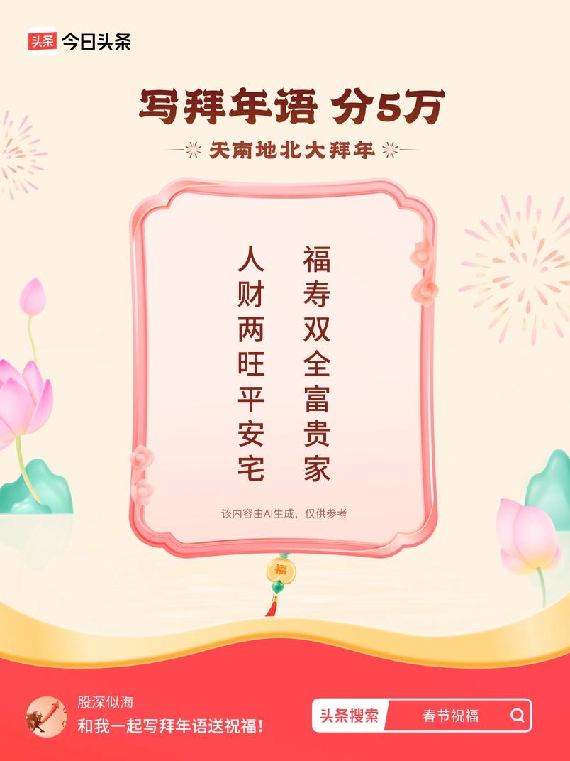 写拜年语送祝福新春拜年送祝福!我的祝福是:“人财两旺平安宅,福寿双全富贵家”!快来一起写祝福吧戳这里,一起领红包>