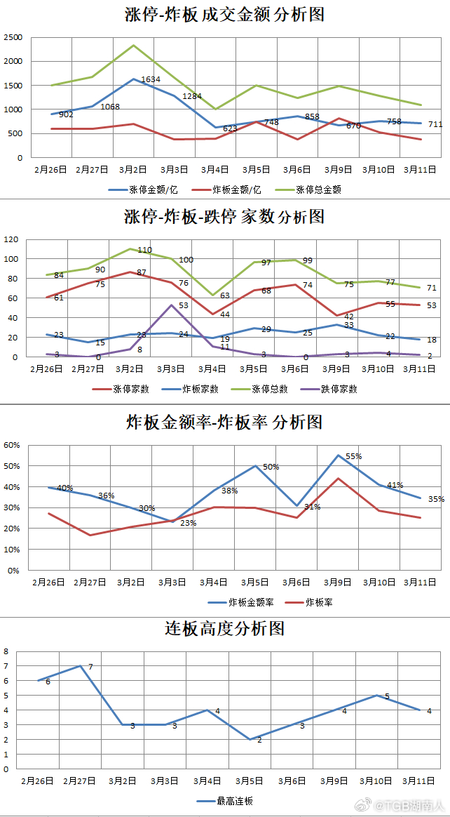 【3.11星期三】 湖南人涨停复盘 "涨停金额:711亿 炸板金额:375亿首板金额:551亿 连板金额:160亿涨停53家 炸板18家 跌停2家首板43家 连板10家" 【市场连板股】10只 160亿 代码 名称 末次时间 连板数 原因601789 宁波建工 14:13 4 OpenClaw概念002445 中南文化 9:25 3 资产重组603803 瑞斯康达 9:34 2 光通信000537 绿发电力 9:42 2 智能电网600769 祥龙电业 11:08 2 芯片600172 黄河旋风 11:27 2 AI硬件600108 亚盛集团 13:42 2 农业600726 华电能源 14:03 2 智能电网000839 国安股份 14:17 2 OpenClaw概念603421 鼎信通讯 14:55 2 智能电网【化工】13只 175亿 消息面:全球规模最大的液化天然气出口工厂停摆 002455 百川股份 9:30 1 三羟甲基丙烷603353 和顺石油 9:37 1 成品油+AI芯片000833 粤桂股份 10:05 1/4天2板 固态电池上游+硫铁矿000545 金浦钛业 10:23 1/4天2板 钛白粉600328 中盐化工 13:03 1 纯碱600722 金牛化工 13:15 1/8天4板 甲醇000626 远大控股 13:30 1 棕榈油600989 宝丰能源 13:36 1 烯烃002092 中泰化学 13:47 1 氯碱化工600299 安迪苏 13:51 1 蛋氨酸600409 三友化工 13:51 1 PVC600075 新疆天业 13:54 1/4天2板 PVC600873 梅花生物 14:49 1 氨基酸【智能电网】9只 143亿 消息面:“算电协同”首次写入政府工作报告;原油大涨引发能源危机 000537 绿发电力 9:42 2 算电协同600726 华电能源 14:03 2 绿色电力603421 鼎信通讯 14:55 2 智能电网601700 风范股份 9:35 1 南方电网中标601868 中国能建 9:43 1/4天2板 算电协同001207 联科科技 9:59 1 高压电缆屏蔽料601330 绿色动力 10:09 1 焚烧发电601016 节能风电 10:15 1 储能布局000899 赣能股份 11:01 1 绿色电力【光通信】5只 39亿 消息面:AOI宣布收到1.6T数据中心光收发器首批量产订单 603803 瑞斯康达 9:34 2 光模块603938 三孚股份 9:52 1 光纤+存储上游300504 天邑股份 9:56 1 光纤宽带网络设备603773 沃格光电 10:38 1 玻璃基板(CPO)603936 博敏电子 14:13 1 光模块零部件【光伏】4只 60亿 消息面:光伏组件价格出现实质性上调 002150 正泰电源 9:48 1 储能+光伏逆变器301658 首航新能 10:03 1 储能+光伏逆变器605117 德业股份 10:07 1 储能+逆变器603778 国晟科技 14:31 1/4天2板 储能+钙钛矿光伏组件【其他热点】 600172 黄河旋风 11:27 2 金刚石热沉片002782 可立克 10:11 1 AI电源磁性元器件601789 宁波建工 14:13 4 OpenClaw概念+小米000839 国安股份 14:17 2 OpenClaw概念+AI安全002667 威领股份 9:39 1/4天2板 锂电池001369 双欣材料 13:11 1 锂电池600433 冠豪高新 9:49 1 氢能002733 雄韬股份 10:46 1 氢能600769 祥龙电业 11:08 2 芯片+长江存储000062 深圳华强 14:09 1 芯片+华为海思603757 大元泵业 9:35 1 液冷+供货维谛技术603158 腾龙股份 13:41 1/4天2板 液冷300246 宝莱特 10:27 1 医药002432 九安医疗 11:00 1 医药002175 东方智造 10:46 1 智能制造002248 华东数控 14:04 1 智能制造【其他个股】 002445 中南文化 9:25 3 资产重组601858 中国科传 10:20 1 传媒002177 御银股份 10:38 1 稳定币002831 裕同科技 11:16 1 苹果600108 亚盛集团 13:42 2/9天7板 农业603629 利通电子 14:53 1 算力【涨停炸板】18只 375亿 代码 名称 首次时间 涨跌幅 原因301361 众智科技 10:04 14.60% 智能电网301150 中一科技 10:52 14.33% 新能源产业链002452 长高电新 10:52 8.24% 业绩增长000967 盈峰环境 10:42 7.84% 机器人003041 真爱美家 13:02 7.39% 其他601869 长飞光纤 9:31 7.25% 光通信002015 协鑫能科 9:49 7.17% 智能电网002429 兆驰股份 10:58 6.88% 光通信600330 天通股份 9:37 6.10% 光通信002654 万润科技 11:09 5.80% 内存000516 国际医学 11:06 5.77% 其他000837 秦川机床 9:31 5.45% 其他002547 春兴精工 9:49 5.26% 机器人000890 法尔胜 9:40 5.17% 光通信600545 卓郎智能 13:42 5.05% 机器人603381 永臻股份 10:31 2.91% 光伏002903 宇环数控 9:30 -4.02% 机器人605268 王力安防 9:25 -4.69% 其他