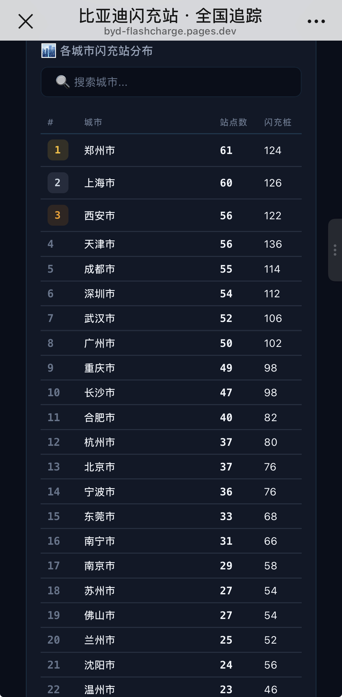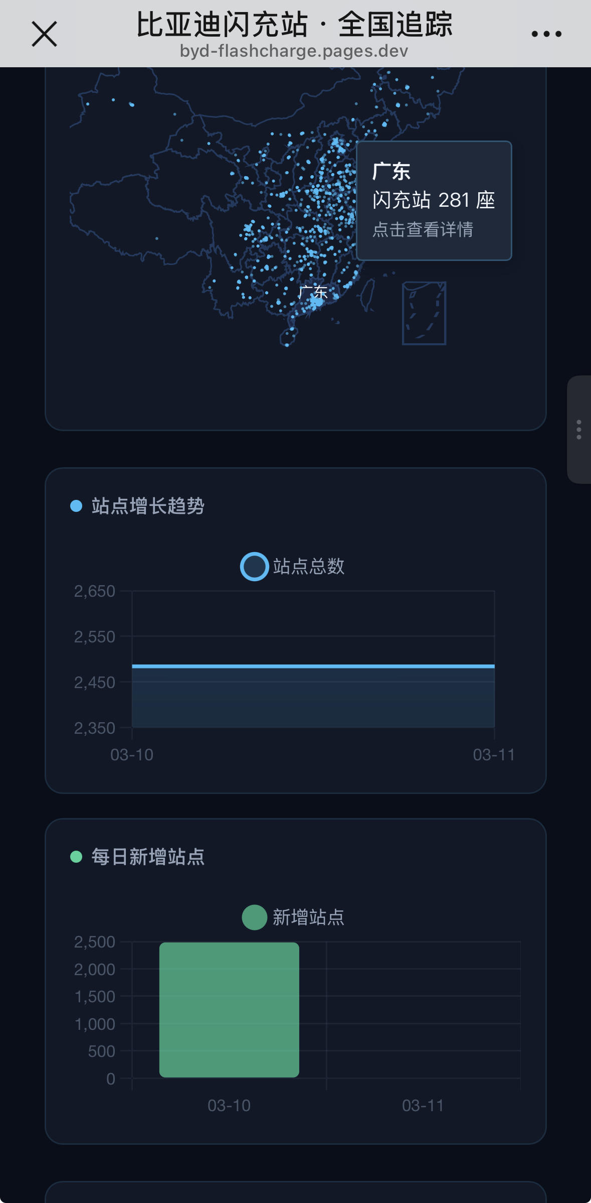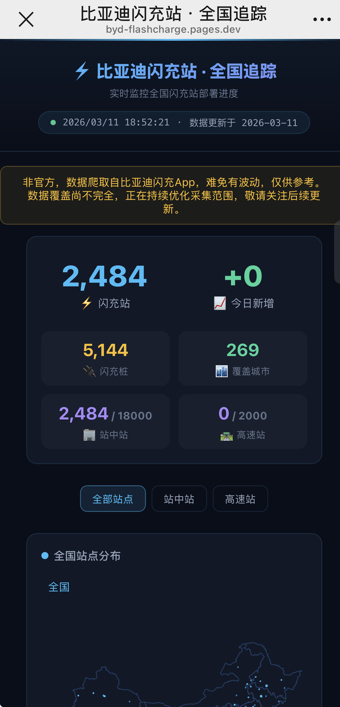 【闪充中国监工上限】一个网友了做个一个网站→_→ 网页链接 ,可现实实时观察比亚迪闪充桩站点情况与每日建站情况,虽非比亚迪官方出品,但其通过爬取公开数据,以可视化方式实时追踪“闪充中国”战略落地进展情况。一边监督,一边可以观测一下闪充桩到底会不会对电网有影响,对运营商有没有助力。按理说电网是可控1️⃣ 储充一体——可谷电蓄能,峰时放电,不靠实时大电流;2️⃣ 无需增容——630kVA老电房也能装,老旧小区轻松部署;3️⃣ 削峰填谷——未来接入虚拟电厂,反成电网“稳定器”。对运营商而言1️⃣ 零成本升级——设备、施工全由比亚迪出,场地方乐见其成;2️⃣ 收入提升——用户多、周转快,月收入应该会上涨;3️⃣ 开放共享——所有品牌都能充,客流只增不减!感觉,迪子的本意是想用硬核闪充技术树立行业新标杆,同时带着补能生态链完成一次升级改造,为后续虚拟电厂布个棋子。