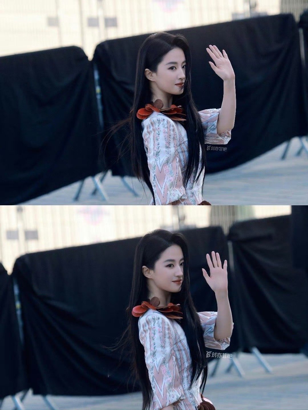 刘亦菲这条裤子挺养生,毕竟降温了肚脐眼必须护住啊