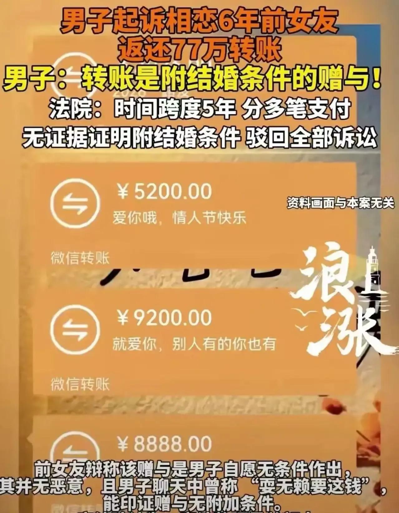 恋爱6年转了77万,分手后男子竟一纸诉状将女友告上法庭,要求返还所有转账!这究竟是“白嫖”还是合理诉求?法院又会如何判决呢? 在四川成都,有这样一对情侣,他们谈了长达6年的恋爱。在这期间,男子对女友可谓是慷慨解囊,累计转账高达77万。然而,好景不长,两人最终因各种原因觉得不合适,决定分手。可没想到,分手后男子立马变脸,他起诉女友,要求返还自己转的所有钱,并声称这些转账是附结婚条件的赠与。这一举动立刻引发了网友们的热议,有人认为男子太计较,毕竟恋爱期间的花费是自愿的;也有人支持男子,认为如果转账确实是以结婚为目的,那么分手后理应返还。然而,法院的判决却让男子大跌眼镜。法院认为,男子未能提供充分证据证明转账是附结婚条件的赠与,且双方恋爱期间存在共同消费,因此驳回了王鑫要求返还77万及赔偿律师费的全部诉讼请求。 恋爱期间的经济往来,总是容易引发各种纠纷。这起案件也给我们提了个醒,在恋爱中,无论是转账还是其他经济行为,最好都能明确性质,避免日后产生不必要的麻烦。对此你怎么看呢?快来评论区留言讨论吧!70万离婚案 情侣分手还钱