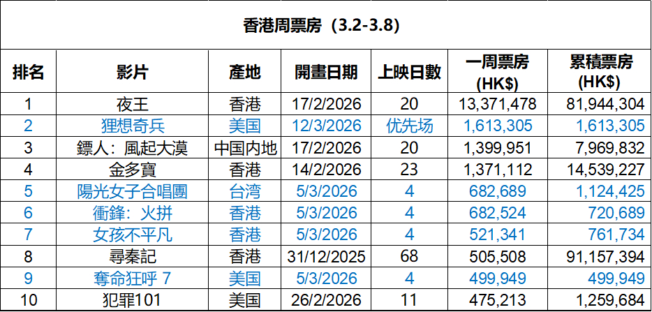 2026年第10周香港票房 :1.《夜王》稳居冠军,港澳最新累计票房破9000万;2.《河狸变身计划》优先场表现出色;3.《阳光女子合唱团》累计票房破100万。(数据:香港贸发局)