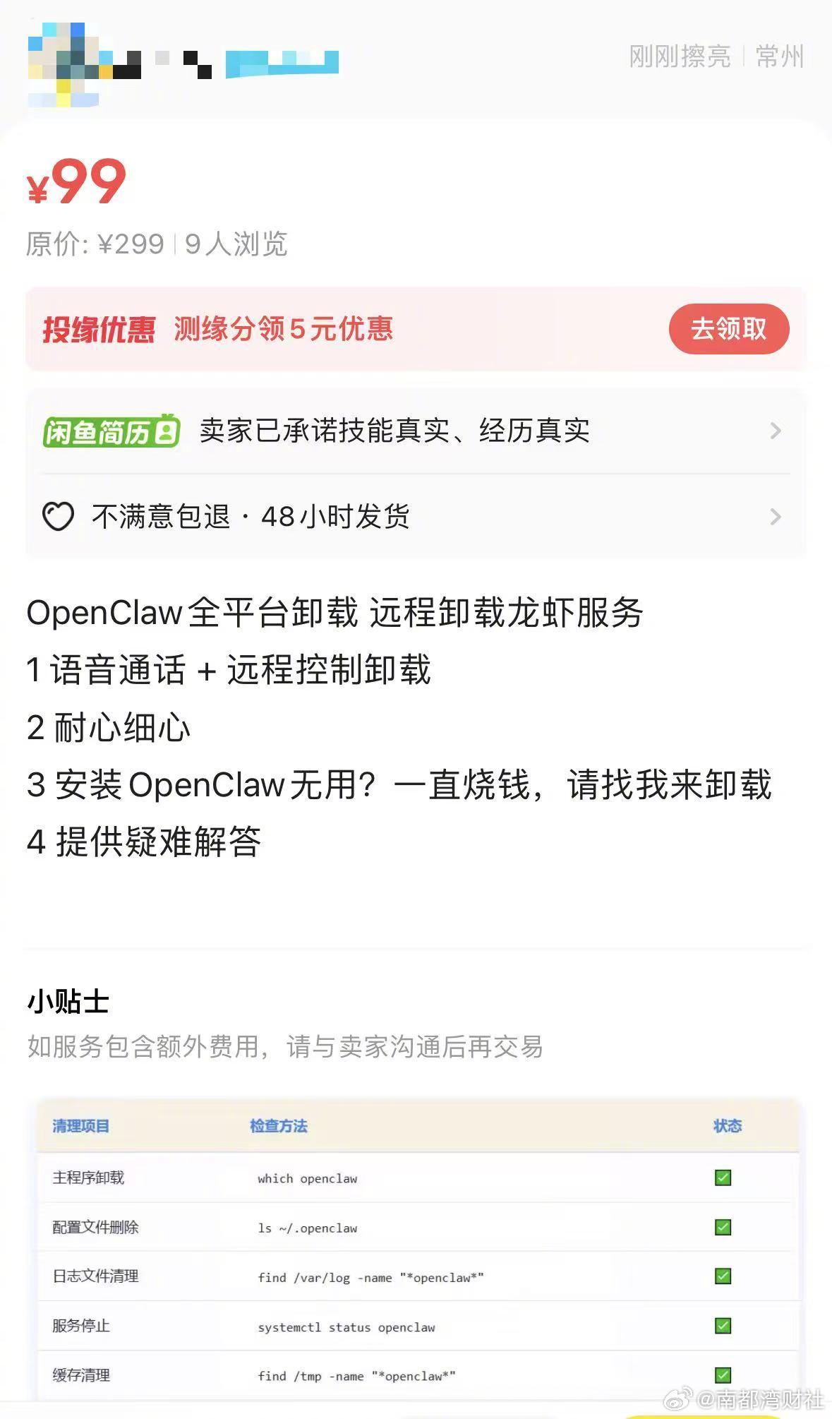 与此同时,二手交易平台出现大量“上门卸载OpenClaw”的生意,报价从29元到299元不等。有提供卸载服务的商家告诉南都N视频记者,“有用户是花钱部署的定制版,需要从根目录一点点删除,因此收费较贵。”互联网AI项目从业人员也称,常规的卸载方法虽然能移除程序本身,但往往会留下各种凭证和配置文件。