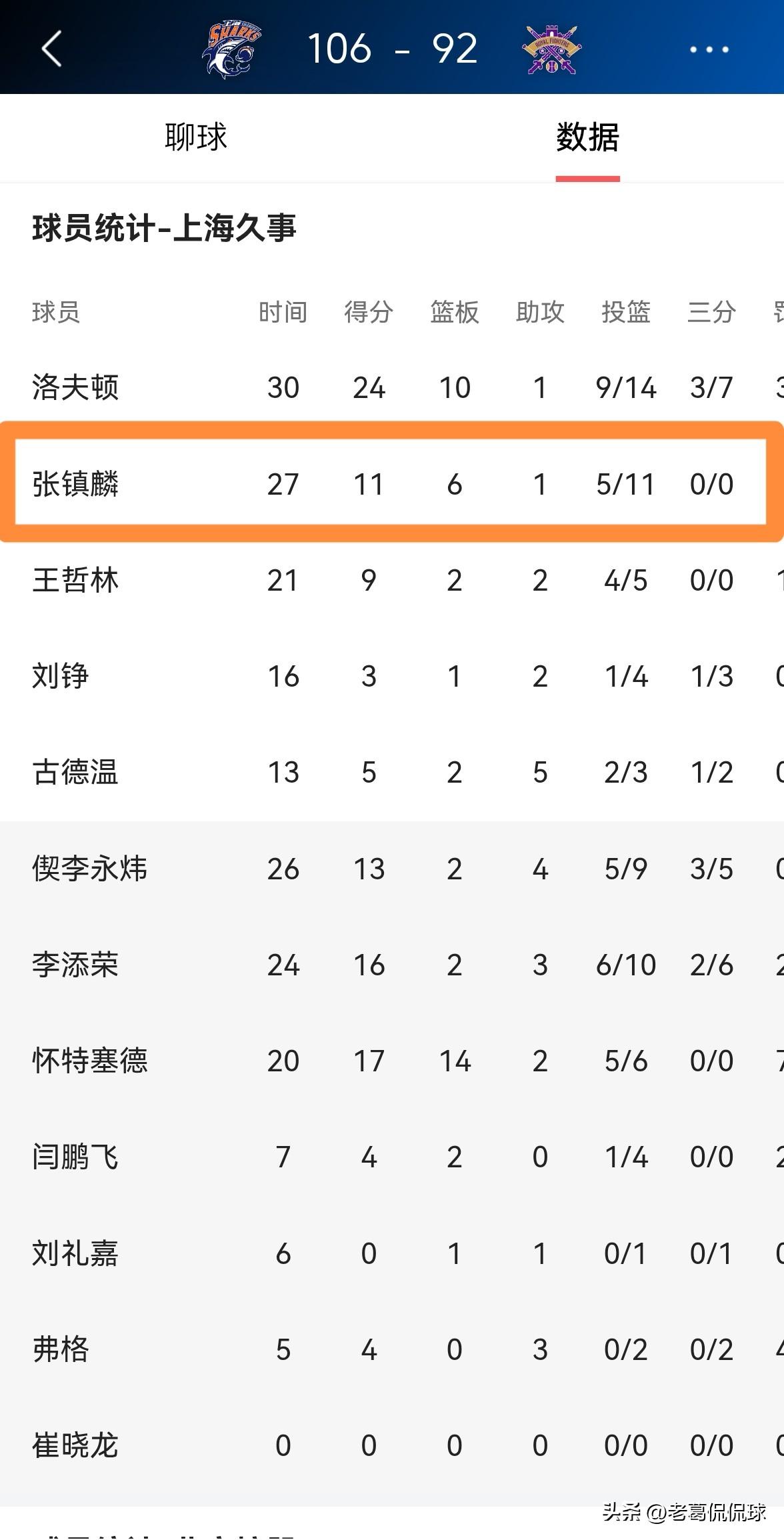 上海久事巨星张镇麟的调整能力真是太强了!在今天上海久事主场以106:92击败北京控股的比赛中,张镇麟在上半场比赛发挥低迷的情况下,及时的在下半场比赛中调整好了自己的状态,最终帮助球队赢下了一场宝贵的胜利。 整场比赛下来,张镇麟首发出战27分钟,投篮11中5,其中罚球2中1得到11分6篮板1助攻2抢断1盖帽,他的场上正负值为+3。 值得一提的是,张镇麟的得分全部来自于下半场比赛,老实说,张镇麟的及时苏醒是上海久事能够获胜的重要原因。