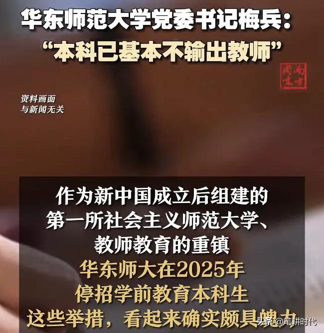 教师过剩?985华师大官宣:本科已基本不再输出教师!有个专业从去年起暂停招收本科生。其实一点也不稀奇,有的师范类直接4+2本硕连读了,因为现在大城市的教师门槛都提升到研究生了。 家长一看这个消息就慌了! 新生儿数量减少,学前教育这个专业从去年起,就暂停招收本科生了。因为国内很多高校能承担本科层次的学前教育师资培养。 华师大称除了面向中西部的优师计划,学校把师范培养重心升级,提升到了研究生阶段。 本研贯通培养模式充满前瞻性,学生在六年内完成本科和硕士学业,毕业即具备硕士学历和教师资格。这个医学临床5+3模式类似。 有些家长不淡定了,认为现在确实是过度教育,30年前的中专师范生十七八岁都参加工作了,现在照样是骨干。小学、初中并不一定非要本科生,放开报名条件,大家公平考就得了。 文科靠积累,理科靠天赋,把很多人的青春浪费在读书中其实得不偿失。 现在教师行业门槛提高,中学教师的培养,已经逐步向研究生层次为主过渡,本科师范毕业生就业难度加大,读研已经成为师范生的“必经之路”。