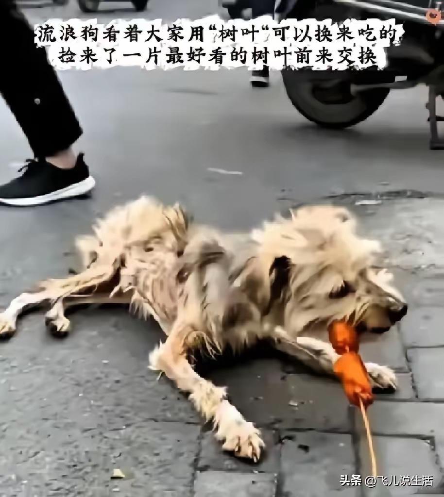 在某个小吃摊前,一只饿了很多天瘦的跟个纸片一样的流浪狗,看到人们用“树叶”可以换香肠,于是在树林里找了个自认为最好看的树叶,小心翼翼的挪到老板面前,也想用树叶换根烤肠,以填饱饥肠辘辘的肚子。 有网友表示:希望老板每天能给它们一些吃的,不一定是香肠,让它们饿不着,祝你生意兴隆,日进斗金,发大财,人善必发财! 老板收养了吧!到你那用树叶换吃的,它多聪明啊!老板人善良,收养它后会有好运,狗来福。 俄罗斯国家的流浪狗,个个膘肥体壮,油光毛亮的,都住在商场附近,俄罗斯老百姓太善良了,商场买回家的大红肠撕一半给野狗吃。 流浪狗基本都不值得同情!它怎么从宠物狗变成流浪狗是有原因的!很多情况是它在原来的家里过分挑食、乱拉乱尿、或是咬人等行为被主人遗弃的。 对此大家怎么看呢
